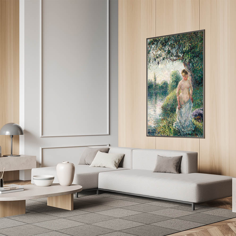 Immerse yourself in the serene beauty of Camille Pissarro's "The Bather." This stunning Impressionist painting captures a tranquil moment by the water, where light dances through lush foliage, highlighting the delicate form of the bather. Pissarro's signature brushstrokes and vibrant palette evoke a sense of peace and connection to nature. This timeless piece is perfect for lovers of Impressionist landscapes and elegant compositions, making it an exquisite addition to any space.