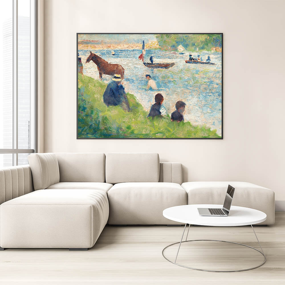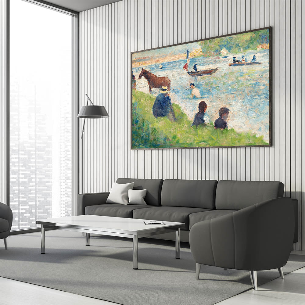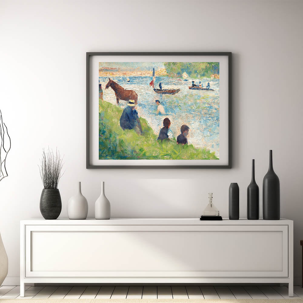 Bring the serene beauty of the Impressionist movement into your home with this captivating wall art print, inspired by Georges Seurat’s "Horse and Boats." Known for his revolutionary Impressionist style, Seurat captures a peaceful riverside scene, where a horse stands by the water as people relax and boats drift nearby. This artwork, rich in color and texture, transports you to a simpler, quieter time in the French countryside.