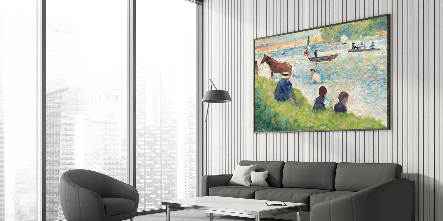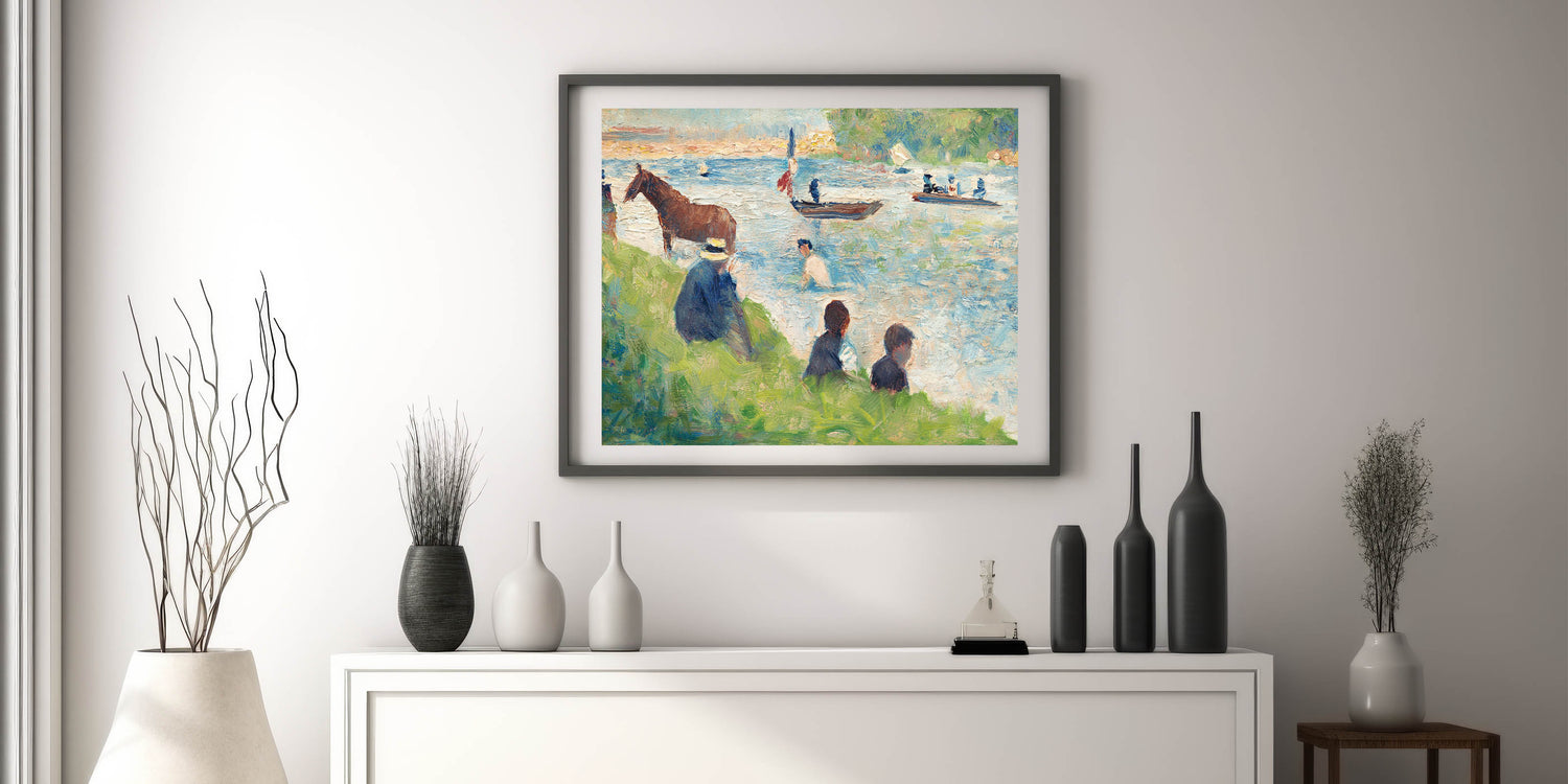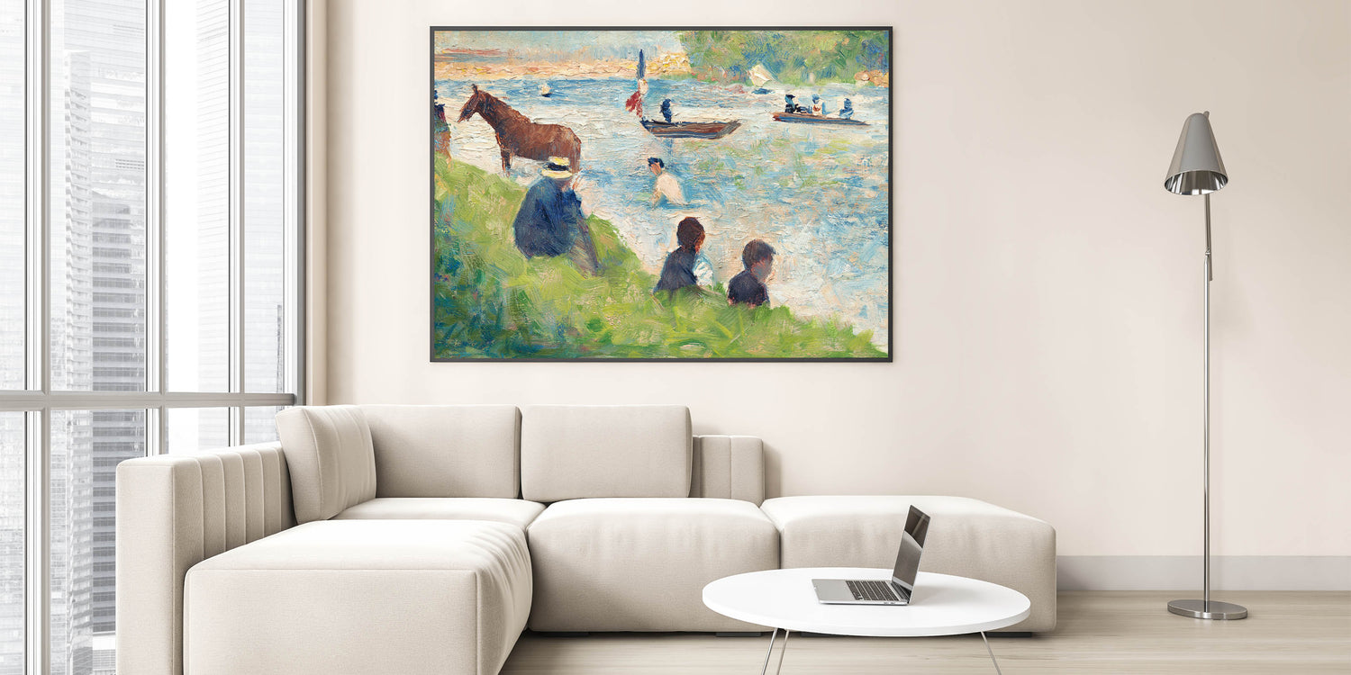 Bring the serene beauty of the Impressionist movement into your home with this captivating wall art print, inspired by Georges Seurat’s "Horse and Boats." Known for his revolutionary Impressionist style, Seurat captures a peaceful riverside scene, where a horse stands by the water as people relax and boats drift nearby. This artwork, rich in color and texture, transports you to a simpler, quieter time in the French countryside.