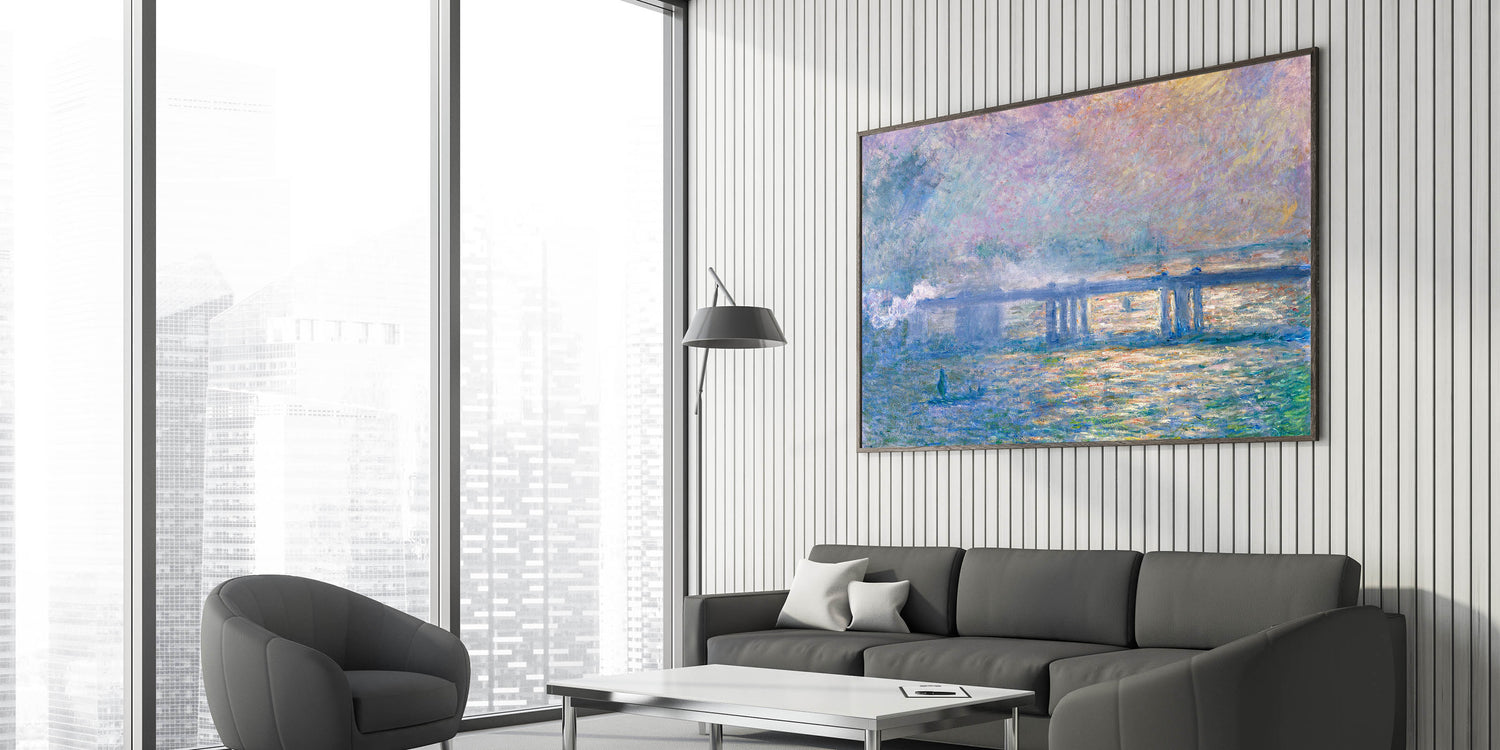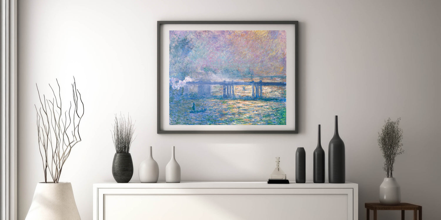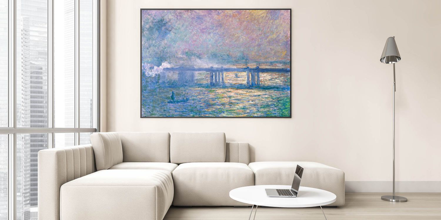 Bring the atmospheric beauty of London to your home with this Impressionist wall art inspired by Claude Monet's Charing Cross Bridge (1903). This painting captures the iconic bridge enveloped in a misty haze, with soft tones of pink, blue, and lavender blending to create a dreamlike ambiance. Monet’s signature brushwork and play of light bring the scene to life, adding a sense of tranquility and elegance to any space.