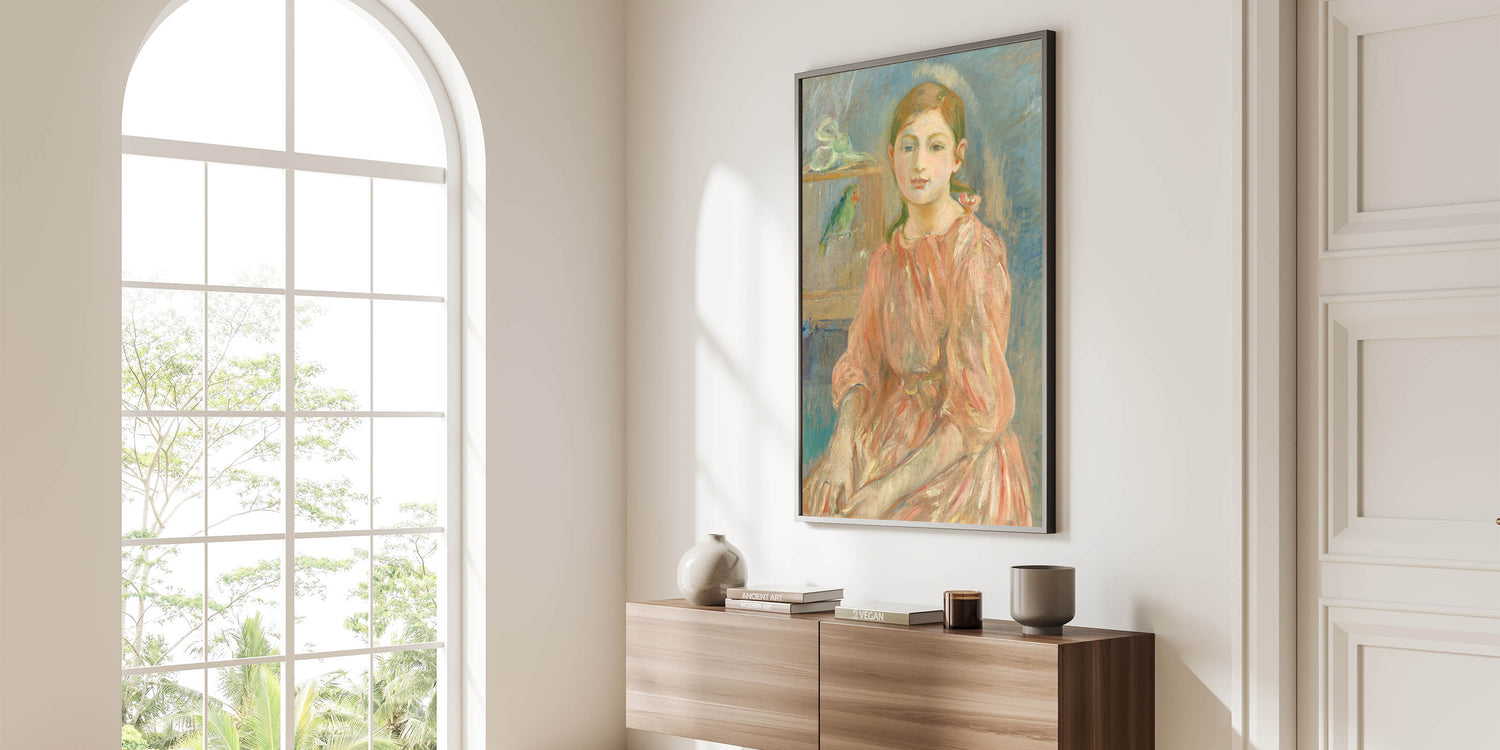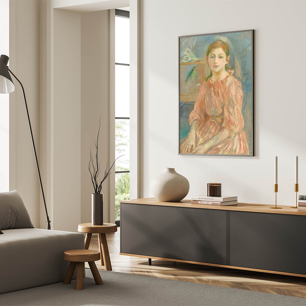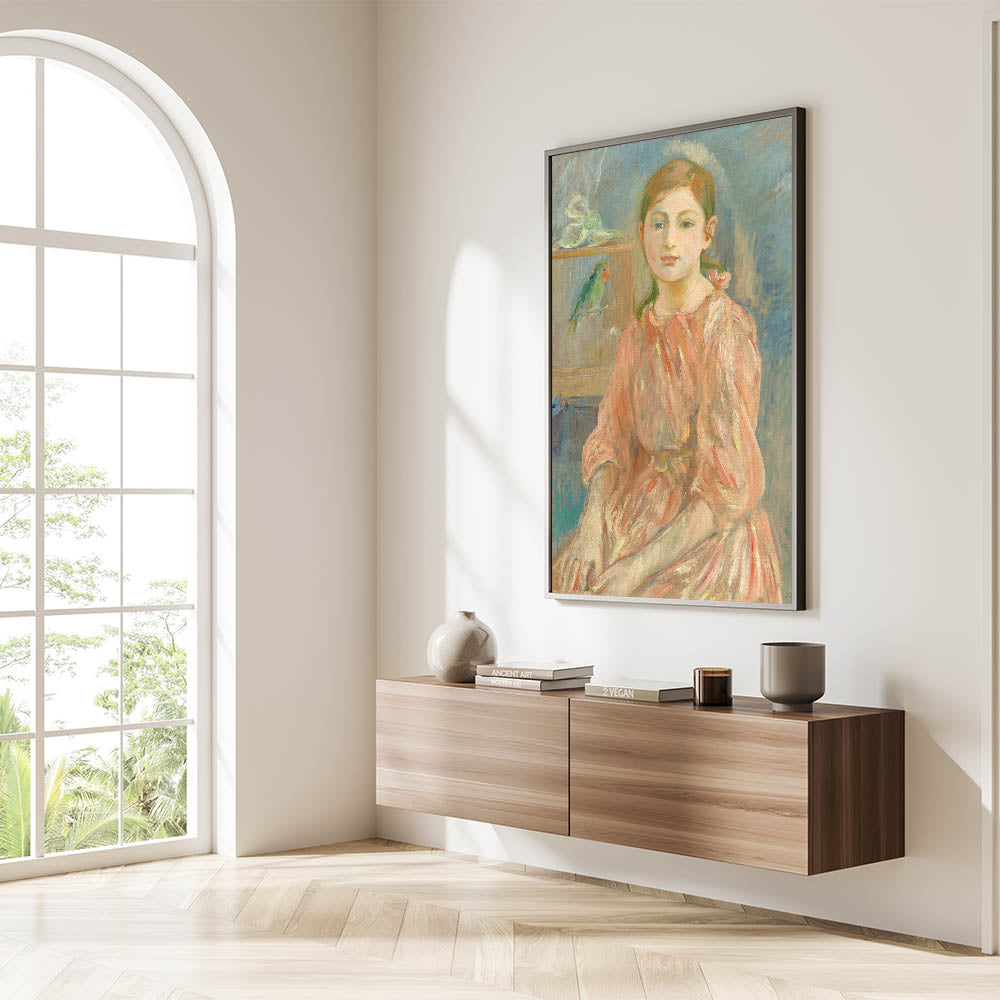 Add a touch of historical elegance to your interiors with this Impressionist wall art inspired by Berthe Morisot's timeless portraiture. "The Artist's Daughter with a Parakeet" is a celebration of artistry and familial warmth.
