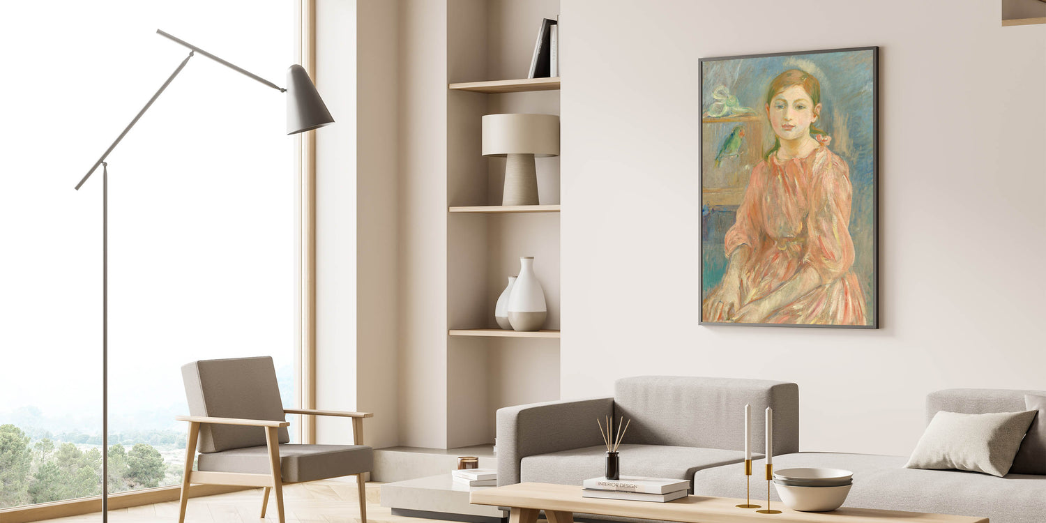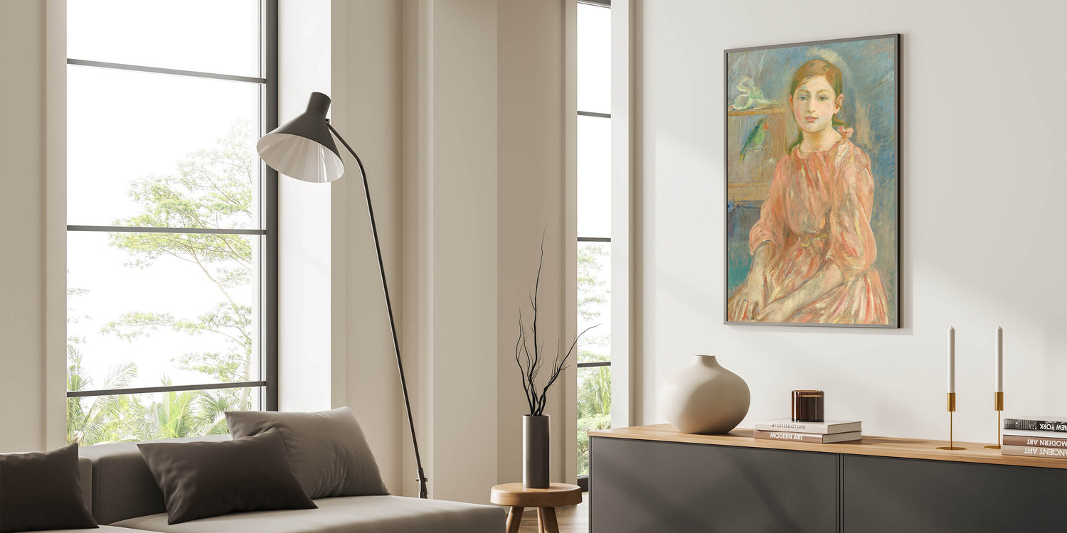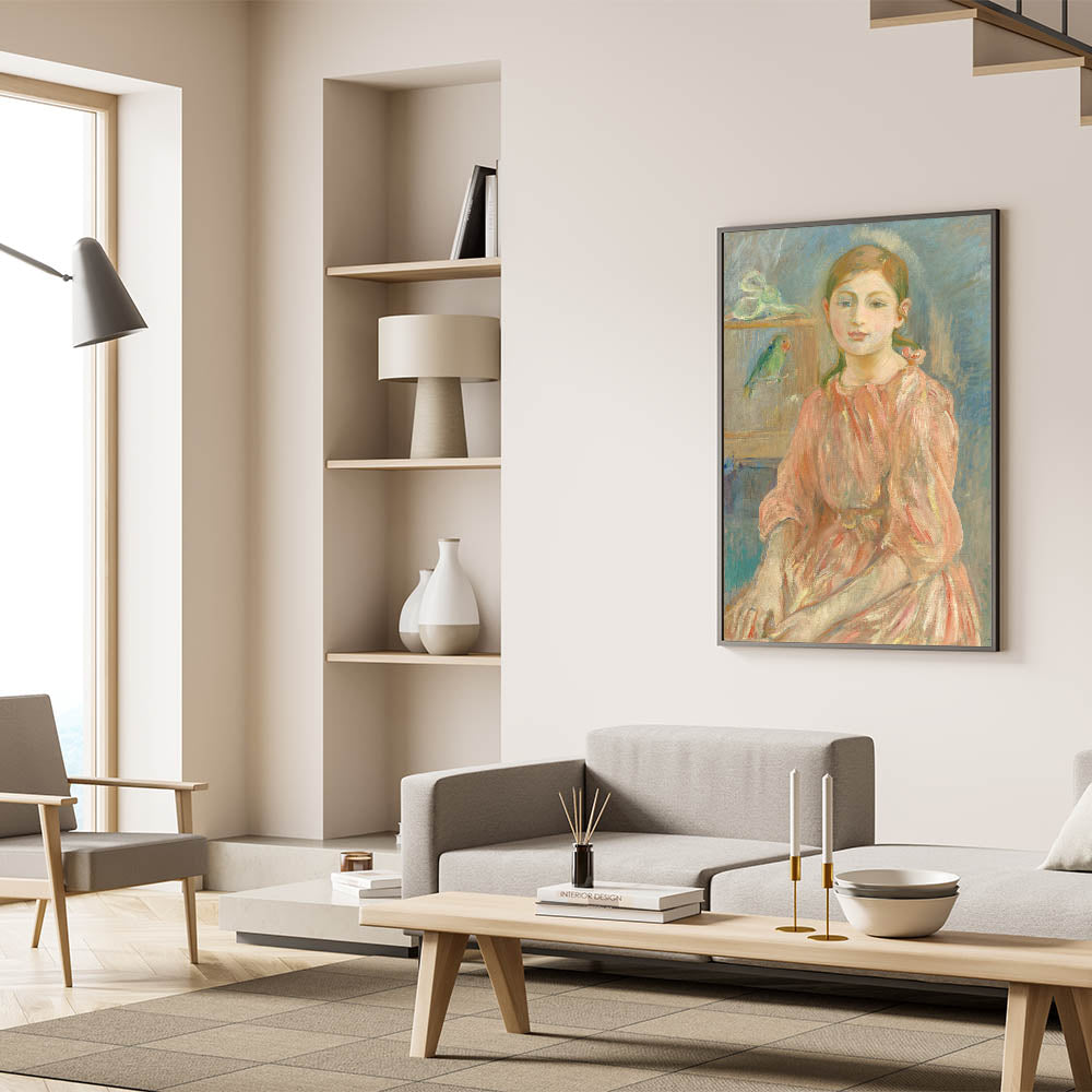 Add a touch of historical elegance to your interiors with this Impressionist wall art inspired by Berthe Morisot's timeless portraiture. "The Artist's Daughter with a Parakeet" is a celebration of artistry and familial warmth.