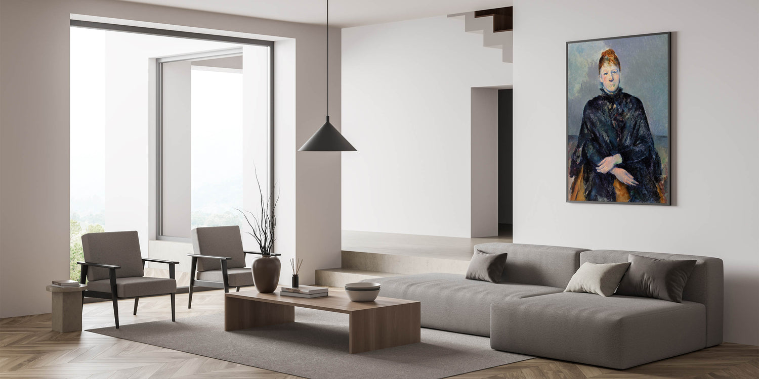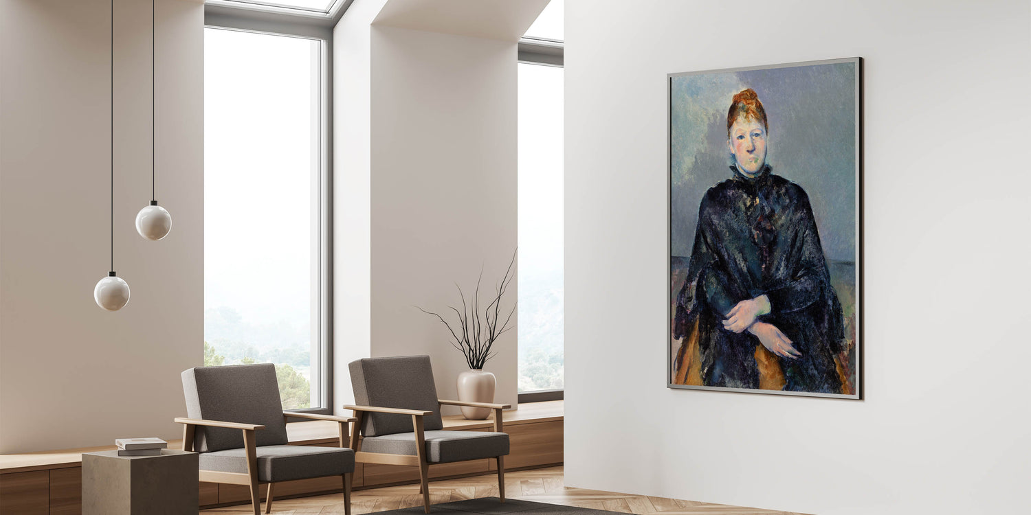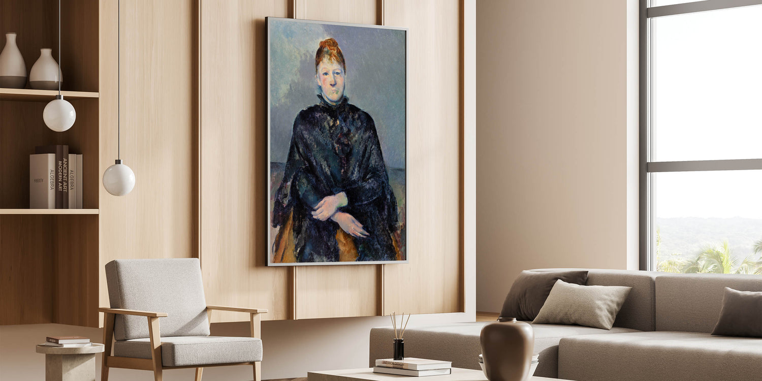 Introduce a timeless sense of elegance to your decor with "Portrait of Madame Cézanne," a captivating work by Paul Cézanne. In this striking piece, Cézanne paints his wife, Hortense Fiquet, dressed in a deep, somber black, against a soft, muted background. The subtle color palette and contemplative mood make this artwork an exquisite addition to any art lover's collection.