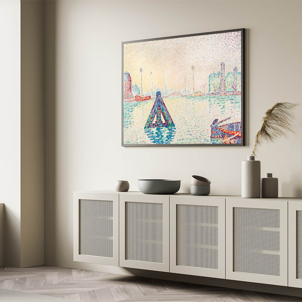 Bring a vibrant, pointillist masterpiece to your home with Paul Signac’s "The Buoy in Holland." This artwork, created in the Neo-Impressionist style, captures a serene seascape with colorful, precise dots that evoke light and movement. The buoy, painted in bold hues, stands against a soft horizon with boats and buildings in the distance. Signac’s innovative technique creates a visually dynamic piece, perfect for those who appreciate Impressionist seascapes and unique art styles.