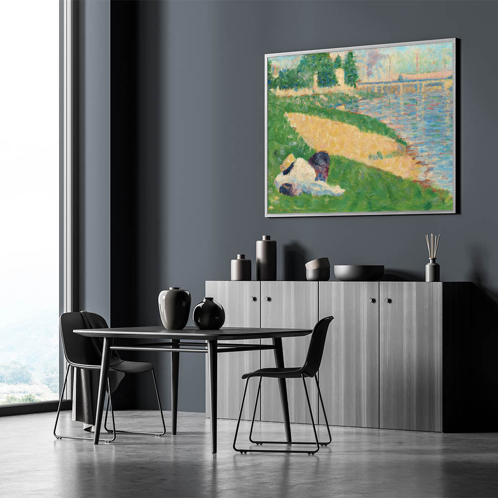 Immerse yourself in the innovative beauty of Georges Seurat’s "The Seine with Clothing on the Bank," a captivating study for his renowned masterpiece "Bathers at Asnières." Created between 1883 and 1884, this artwork exemplifies Seurat’s revolutionary use of light, color, and pointillism. The serene riverside scene, with its lush greenery and shimmering water, reflects the calmness of nature while demonstrating Seurat’s precise, yet emotive brushwork.