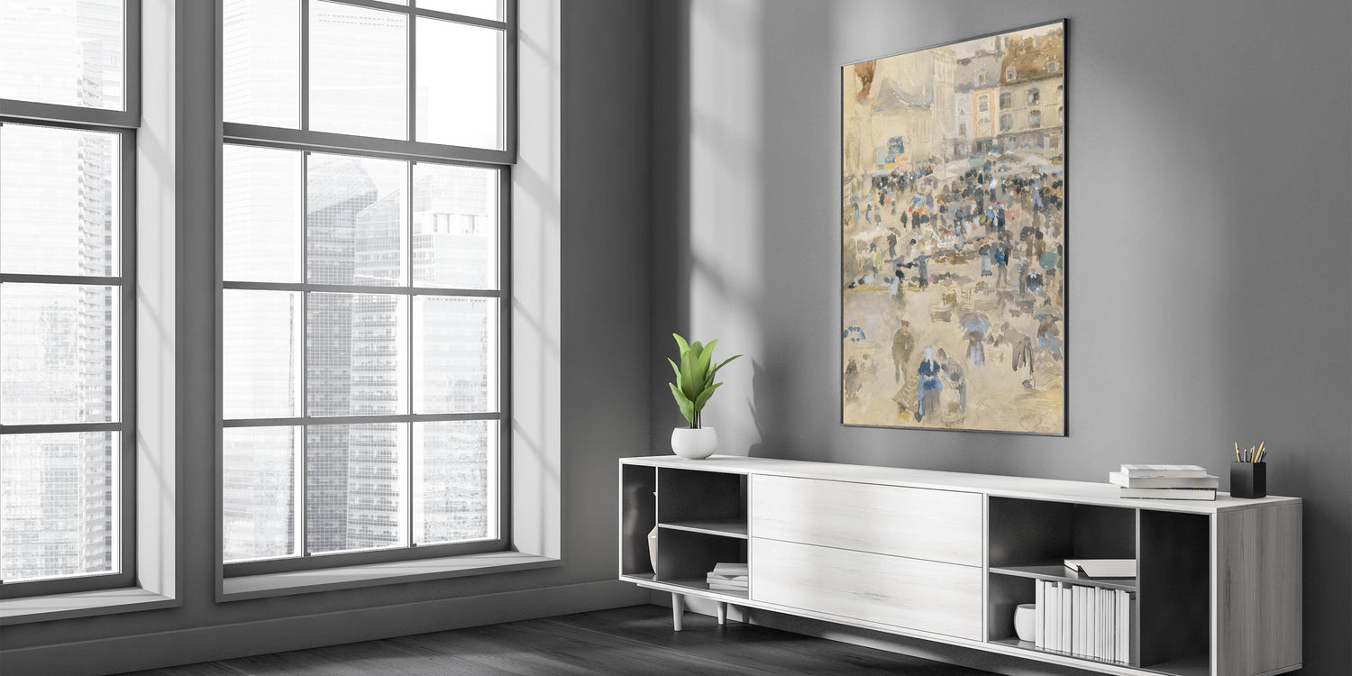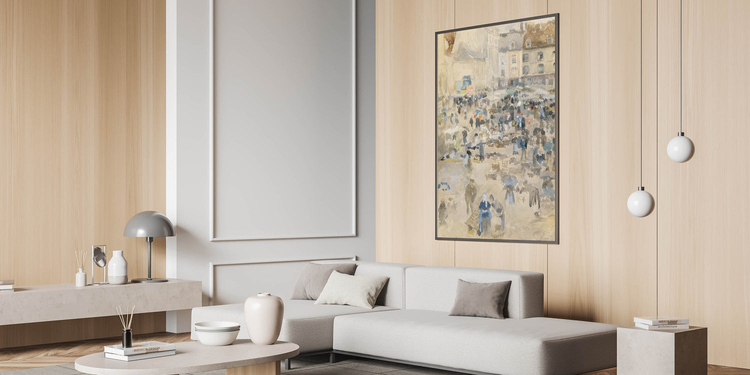 Experience the tranquil beauty of Impressionism with "Market Place, Dieppe" by James McNeill Whistler. This exquisite painting captures a bustling market in soft tones of violet and gray, reflecting Whistler’s mastery of light and atmosphere. Perfect for creating a serene yet dynamic focal point in your living room, office, or bedroom.