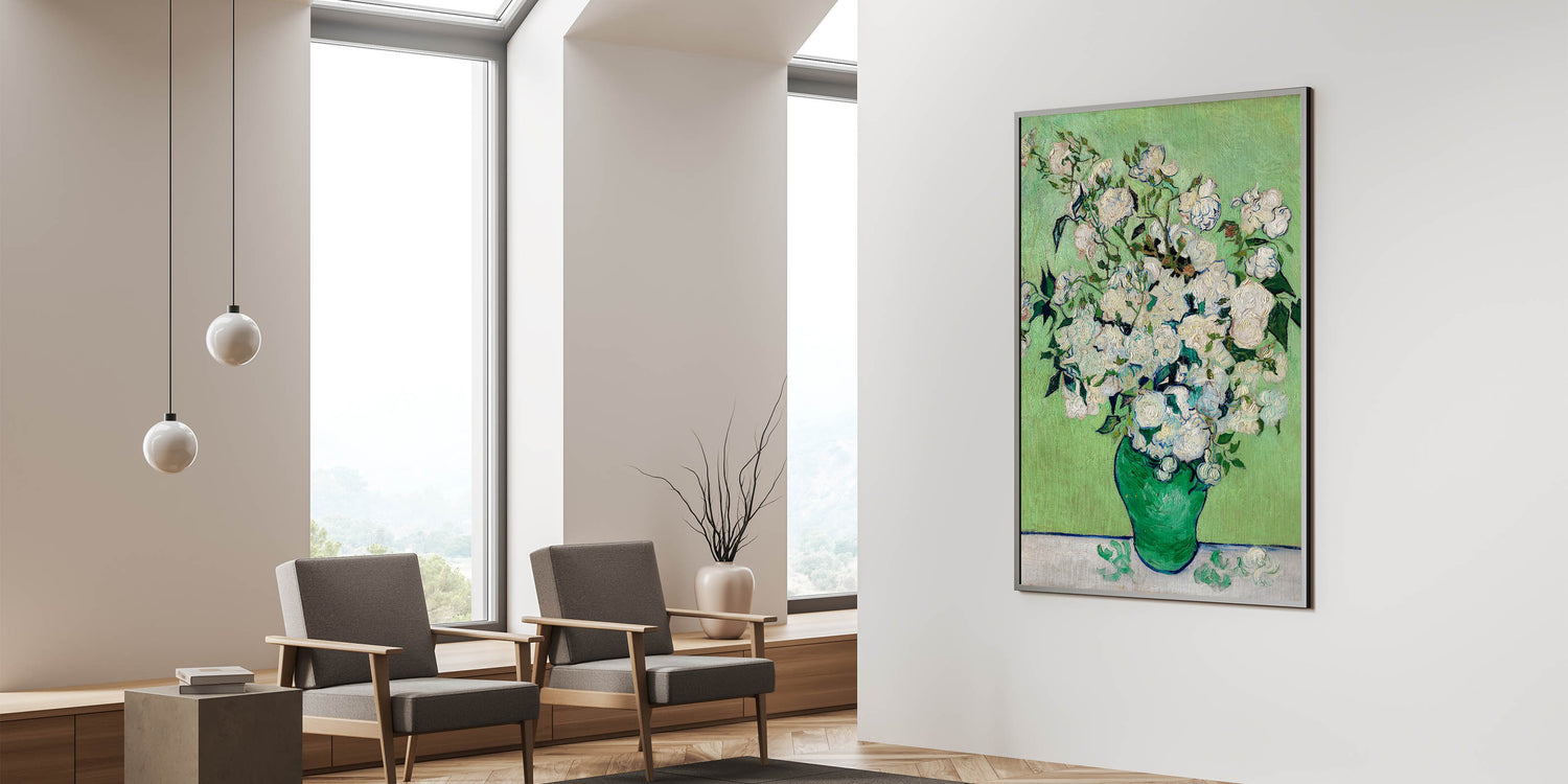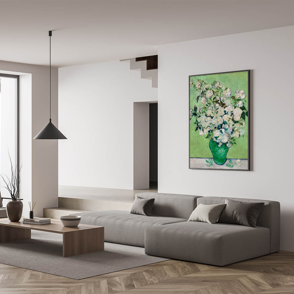 Bring the delicate beauty of Van Gogh’s “Roses” into your space with this Impressionist wall art. Painted in 1890, this masterpiece features a lush bouquet of white roses in a vibrant green vase, set against a soft green background. The textured brushstrokes and intricate detailing exemplify the artist’s unique style and deep appreciation for nature’s fleeting beauty. This timeless artwork embodies the essence of French Impressionism and is perfect for enhancing your home or office décor.