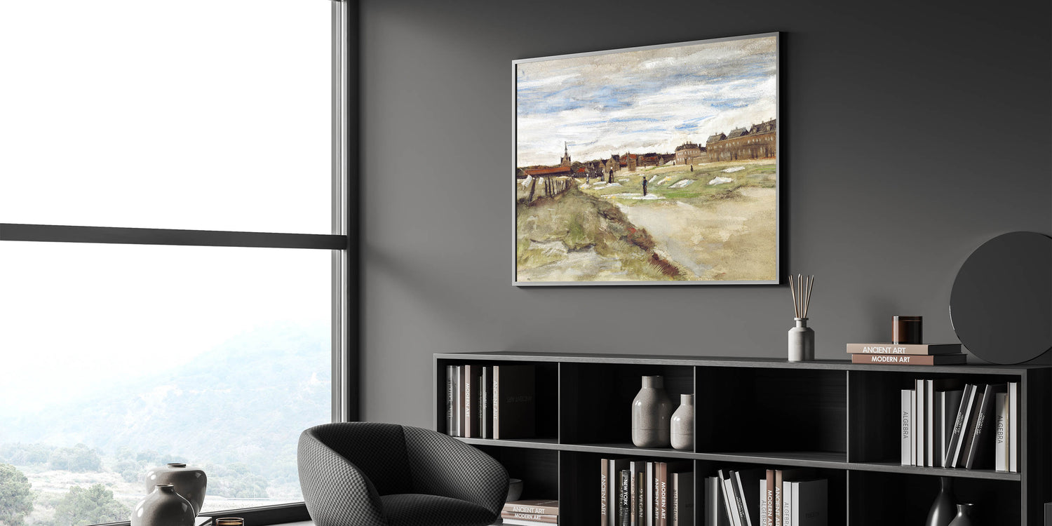 Enhance your space with this Impressionist wall art, inspired by Vincent van Gogh's Bleaching Ground at Scheveningen. This artwork captures a quiet rural scene with figures scattered across an open field, set against a backdrop of simple buildings under a vast sky. Van Gogh’s delicate use of muted colors and subtle brushstrokes bring an air of nostalgia and calm to any room.