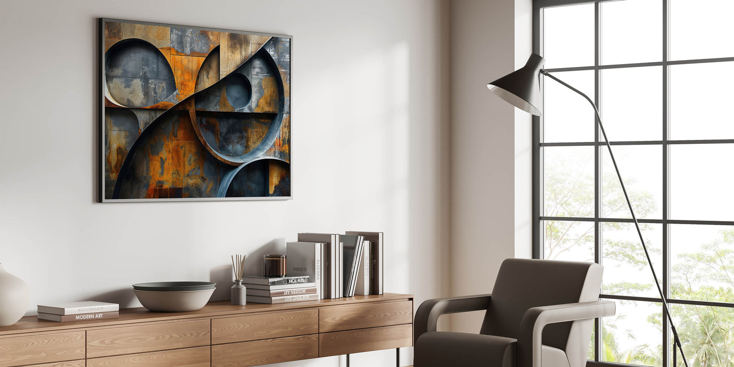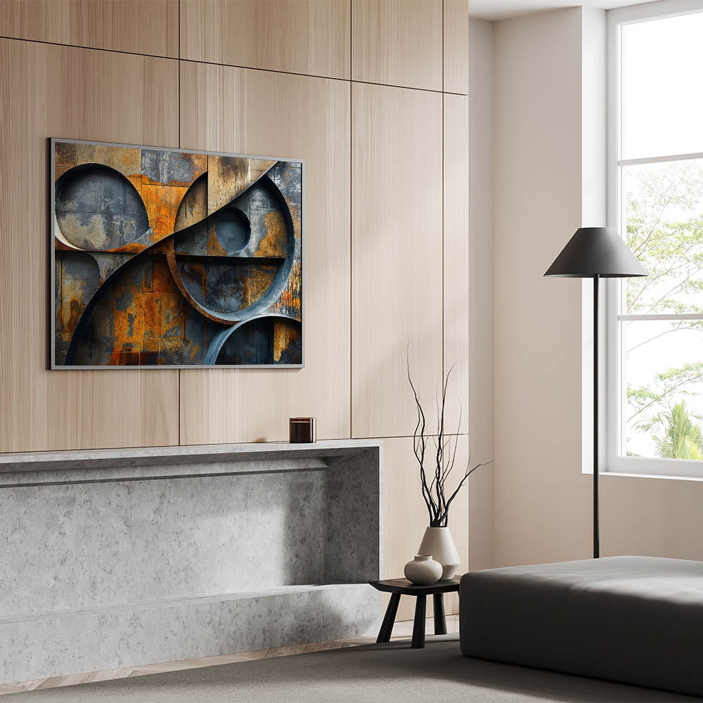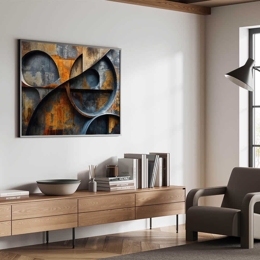 Bring a bold, industrial edge to your interior with this stunning Brutalist Wall Art. Featuring overlapping circular geometric shapes against a richly textured backdrop of weathered metal, this artwork reflects the essence of Brutalist aesthetic with a touch of modern abstraction. The raw, distressed metal surfaces combined with the smooth curves of the circular forms create a unique tension between organic and industrial elements, making this piece a striking focal point for any room.