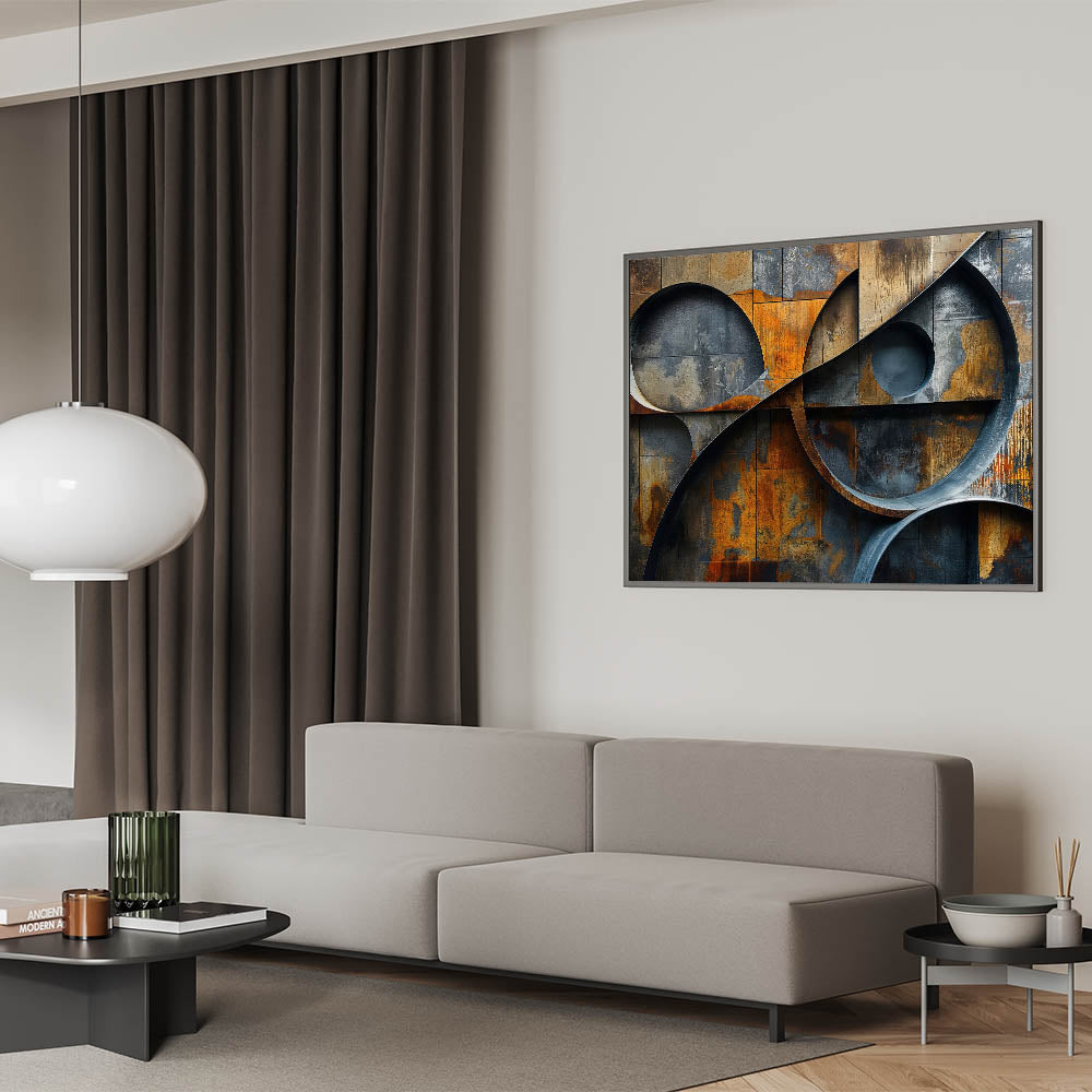 With its rusted tones of orange, brown, and deep grays, this artwork showcases raw concrete textures and industrial design at its finest. Its architectural influences are clear, while the rich color palette adds warmth and depth, perfect for spaces with mid-century modern, minimalist, or urban decor themes. This piece is ideal for those looking to add a statement of modern brutalism art to their living or work environment.