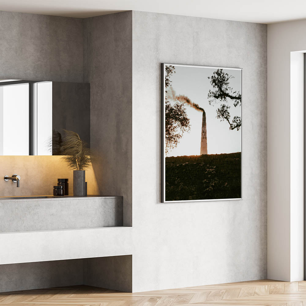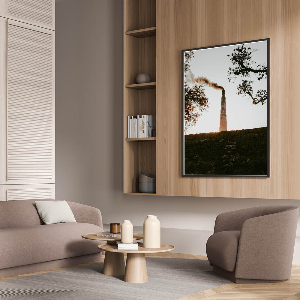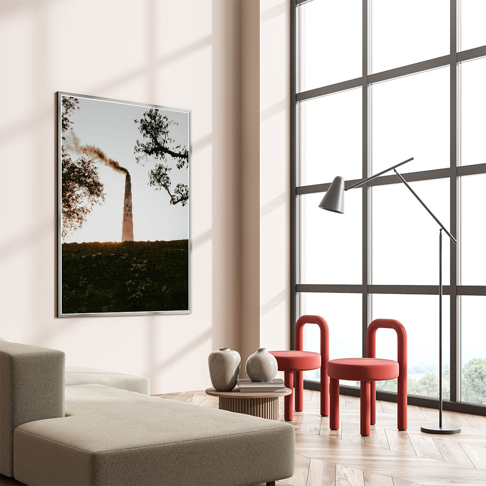 Our Industrial Smokestack Wall Art captures the stark beauty of industrial decay and the resilience of nature. This striking piece features a solitary smokestack emitting plumes against a serene backdrop, symbolizing the intersection of human activity and the natural environment. It's a powerful statement piece that adds a contemplative element to any rustic or industrial-themed decor.