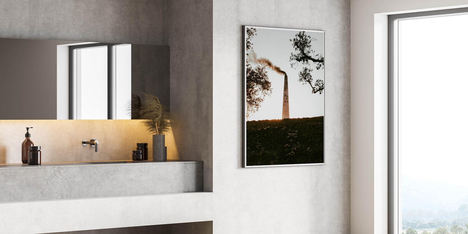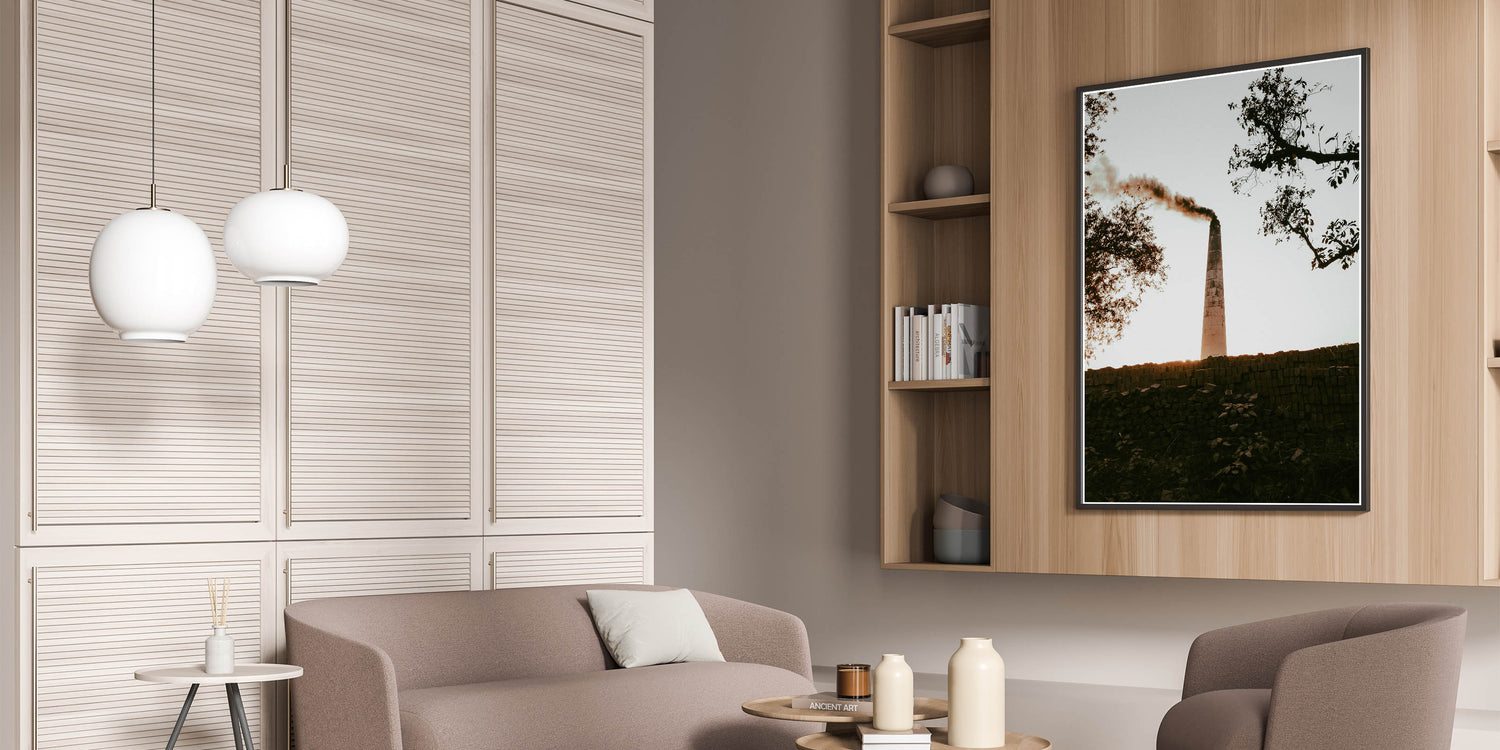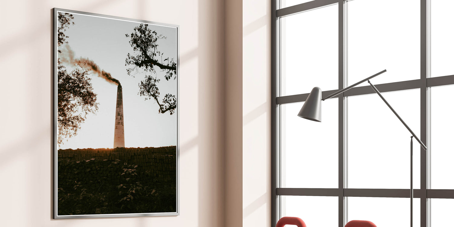 Our Industrial Smokestack Wall Art captures the stark beauty of industrial decay and the resilience of nature. This striking piece features a solitary smokestack emitting plumes against a serene backdrop, symbolizing the intersection of human activity and the natural environment. It's a powerful statement piece that adds a contemplative element to any rustic or industrial-themed decor.