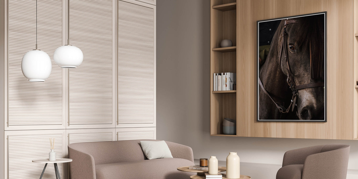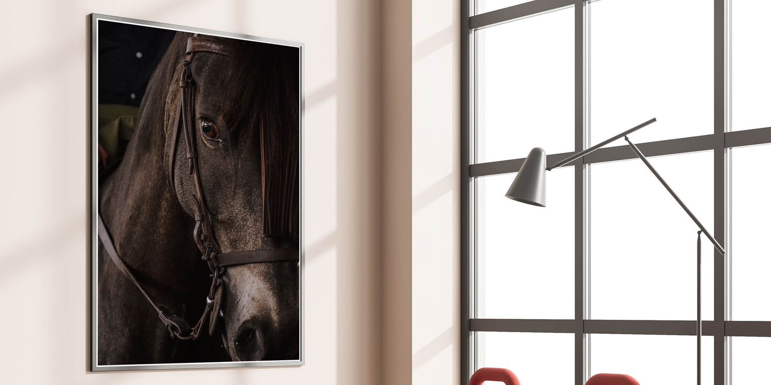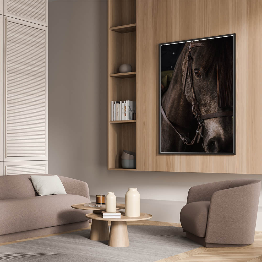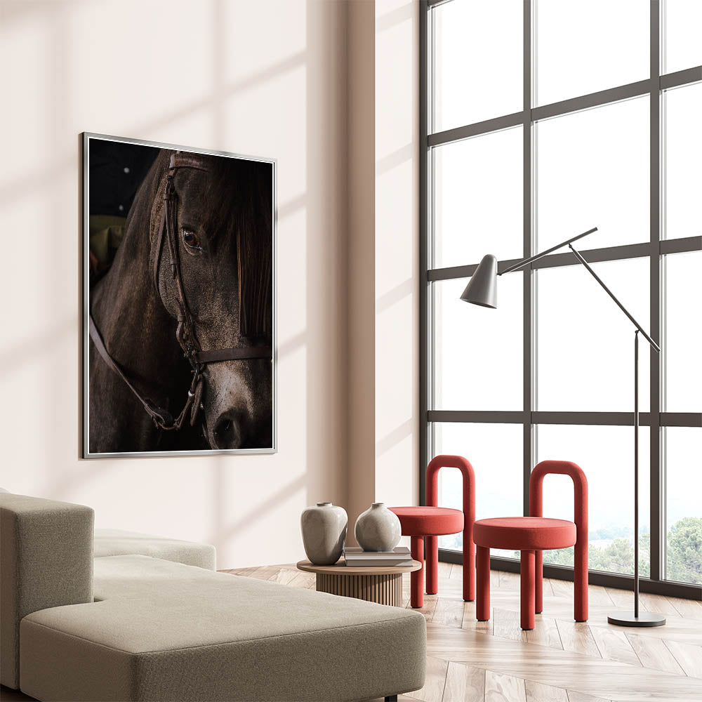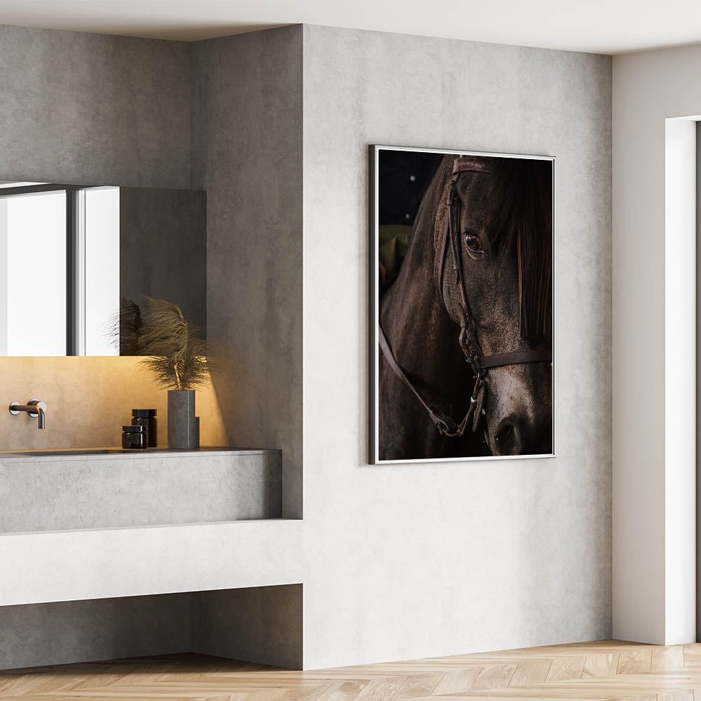 Intimate Horse Portrait" captures the soulful gaze of a horse, offering a deep, emotional connection through the art of photography. This compelling piece highlights the detailed texture of the horse's coat and the intricate elements of its bridle, set against a soft, blurred background that enhances the subject's strong features.