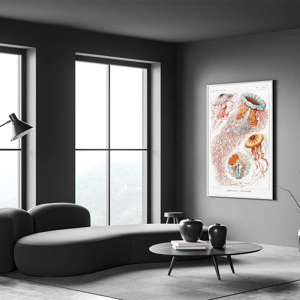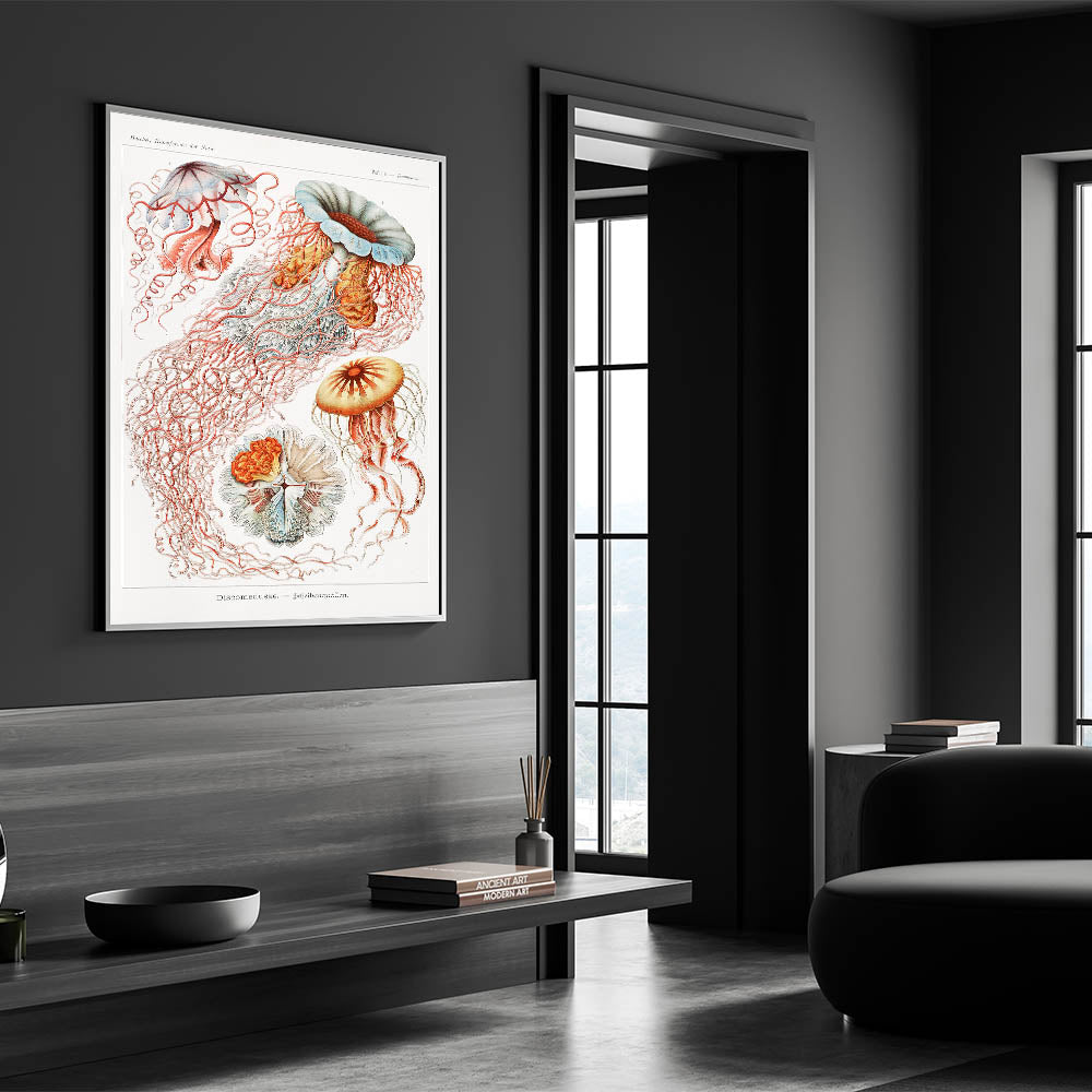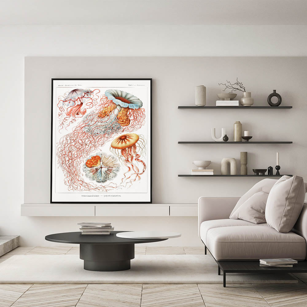 Dive into the depths of oceanic beauty with this intricate jellyfish artwork by Ernst Haeckel. This modern wall art piece, inspired by natural forms and organic structures, brings a captivating, almost surreal view of marine life into your home. The delicate lines and vibrant colors create a stunning piece that embodies the wonder of the ocean and the mystery of its creatures, perfect for trendy home decor enthusiasts and lovers of unique modern art.