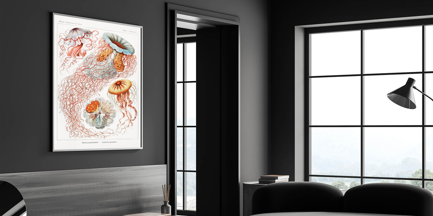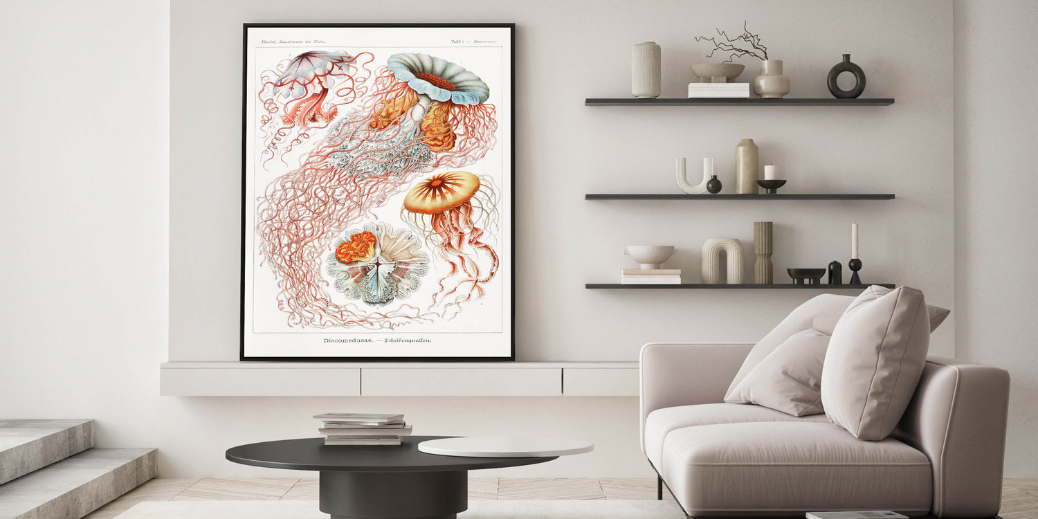 Transform your wall into a vibrant gallery with this elegant representation of ocean life. Ernst Haeckel’s Discomedusae jellyfish art will add a dynamic and colorful touch to any modern decor.