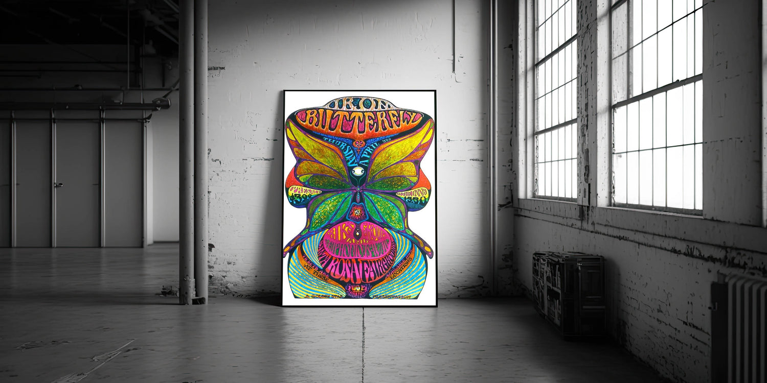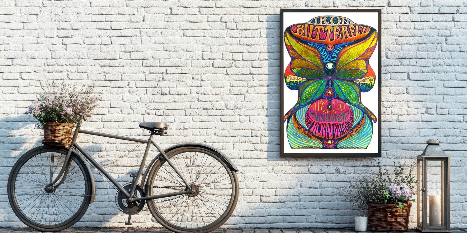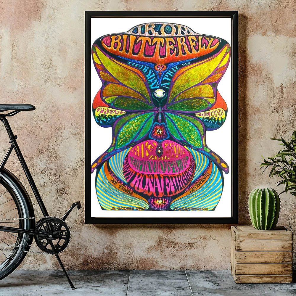Step into the psychedelic era with this Iron Butterfly Retro Wall Art, a Vintage Print from their iconic concert at Santa Rosa Fairgrounds. With a mesmerizing butterfly-shaped design, vibrant neon colors, and bold typography, this Retro Poster Art perfectly captures the spirit of Classic Retro Style and 1960s counterculture. A must-have for collectors, music lovers, and fans of Nostalgic Art Prints.