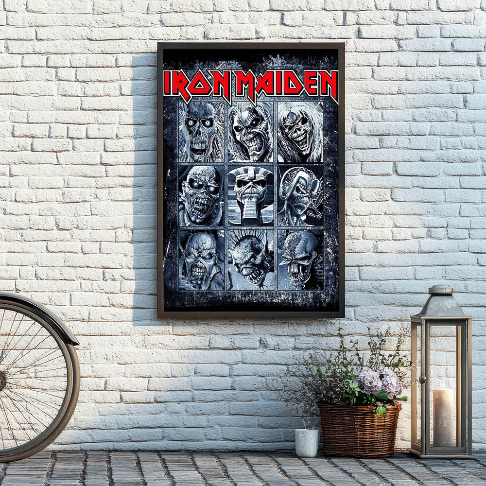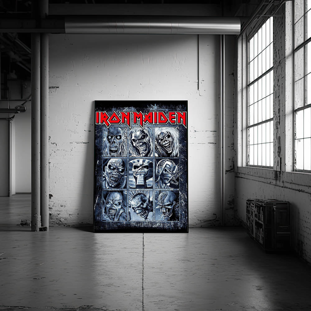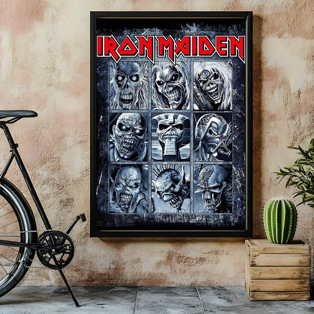Unleash the power of heavy metal with this Iron Maiden Retro Wall Art, a Vintage Print showcasing the legendary band's iconic mascot, Eddie, in multiple fearsome forms. Designed with a dark, distressed aesthetic in blue, black, and white tones, this Retro Poster Art captures the electrifying energy of Classic Retro Style and metal culture. A must-have for collectors, rock enthusiasts, and fans of Nostalgic Art Prints.