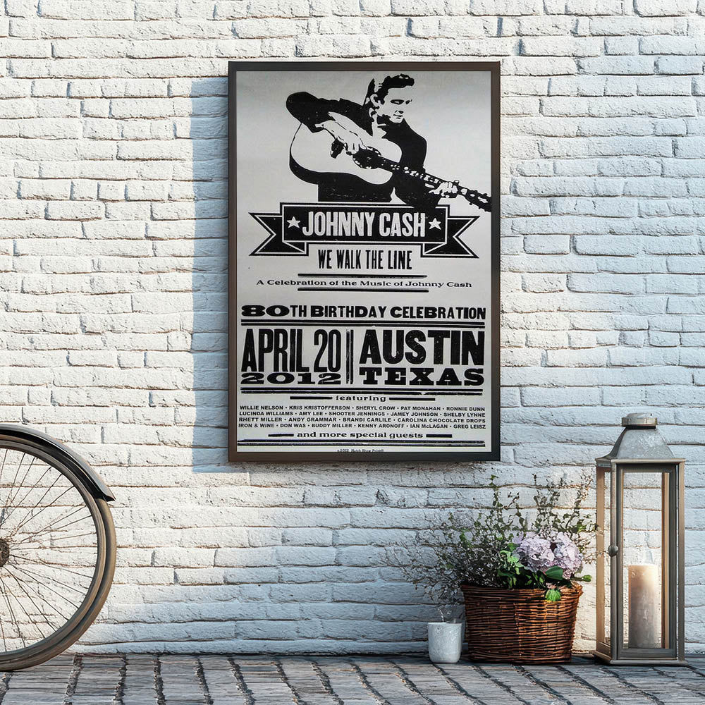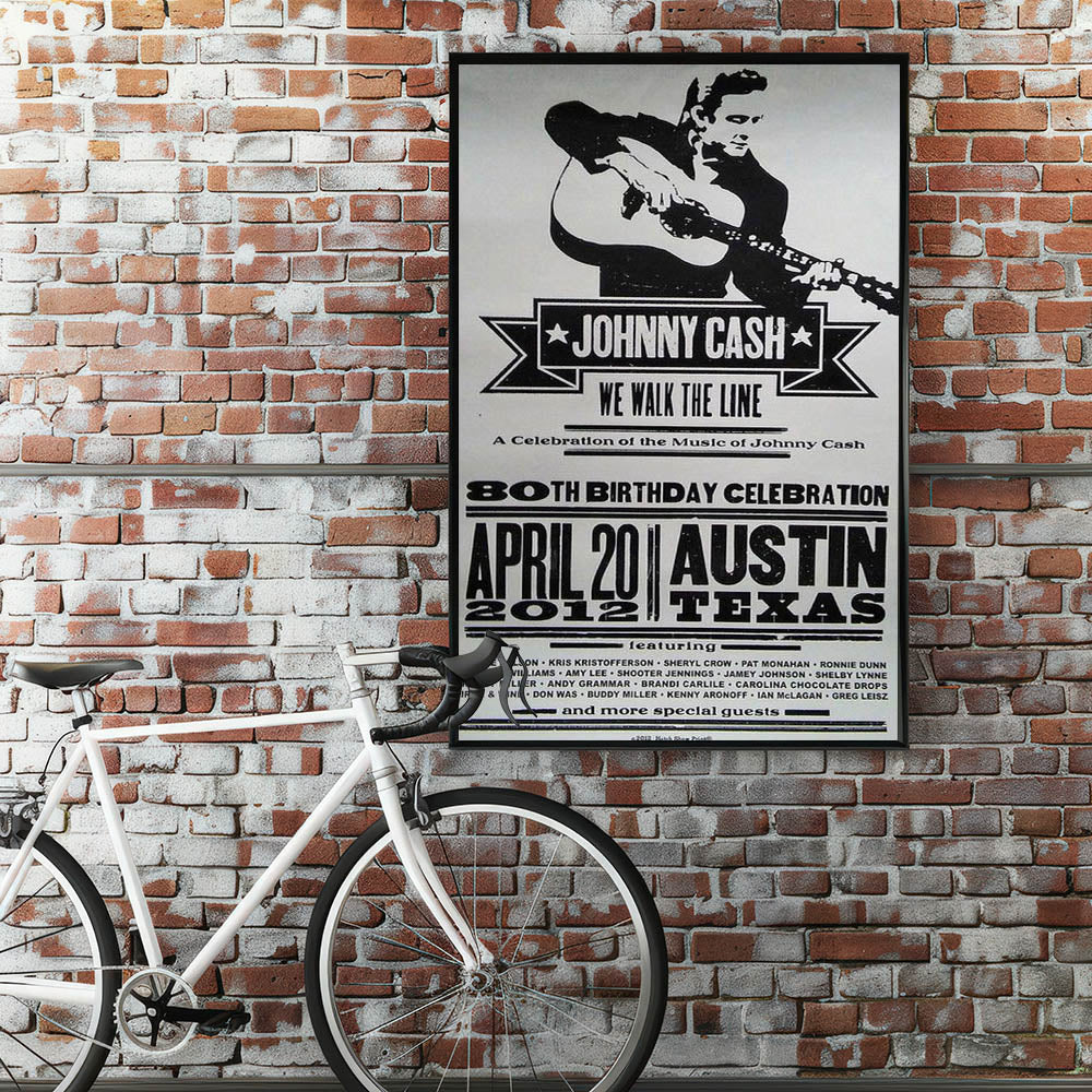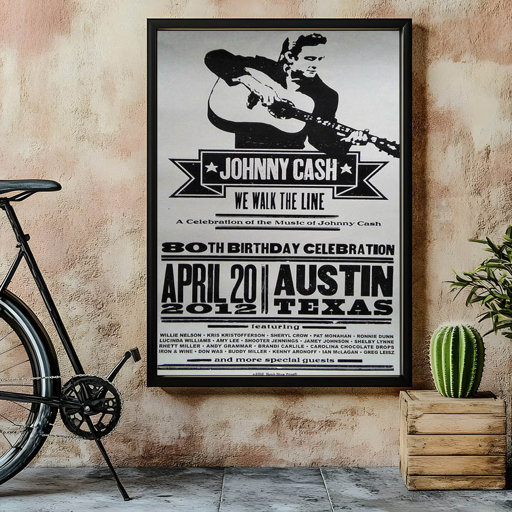 Celebrate the legacy of Johnny Cash with this vintage decor poster, featuring a bold black and white design that embodies the classic retro style of country music history. This retro aesthetic print commemorates Cash’s 80th Birthday Celebration with a striking nostalgic art print, perfect for fans of timeless retro designs and music memorabilia collectors.
