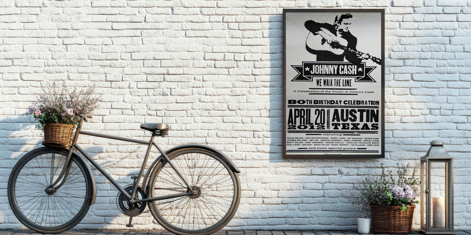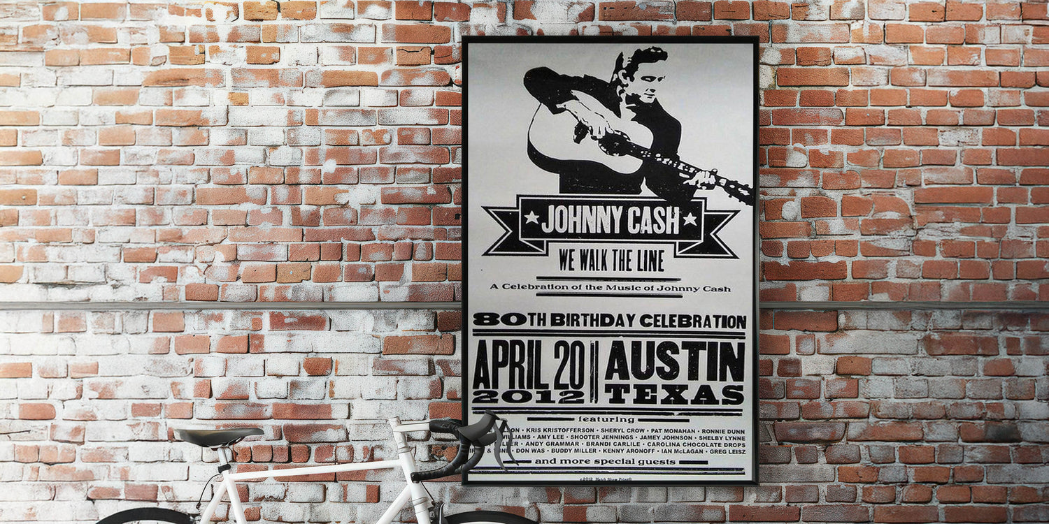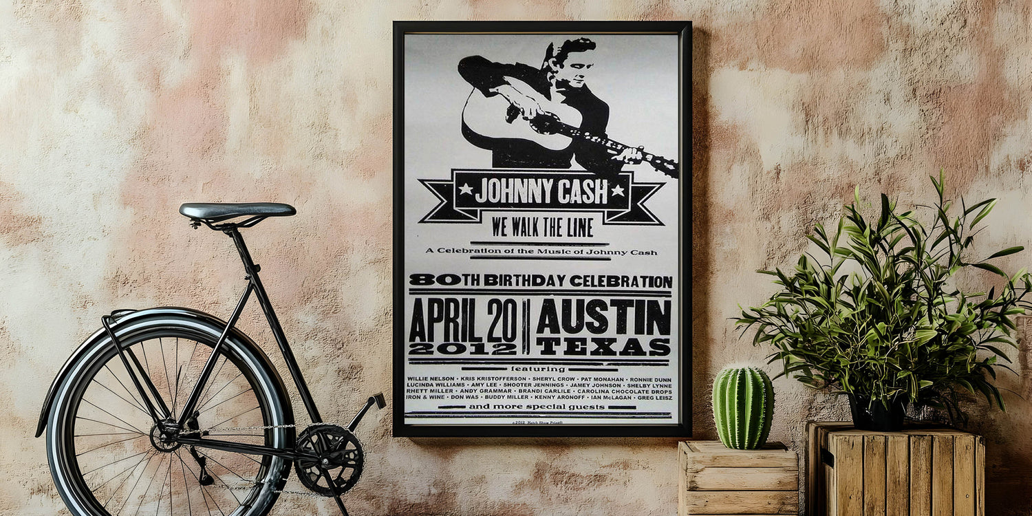 Celebrate the legacy of Johnny Cash with this vintage decor poster, featuring a bold black and white design that embodies the classic retro style of country music history. This retro aesthetic print commemorates Cash’s 80th Birthday Celebration with a striking nostalgic art print, perfect for fans of timeless retro designs and music memorabilia collectors.