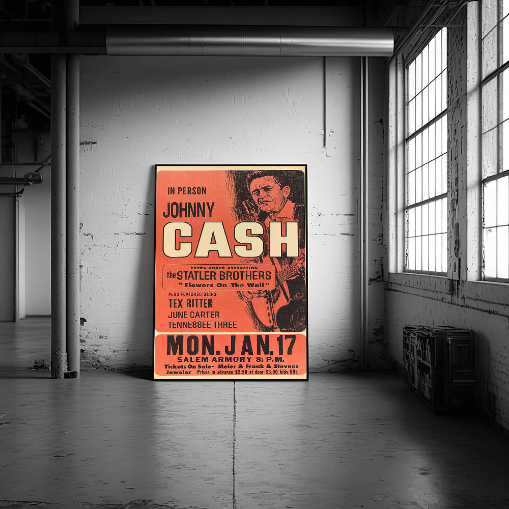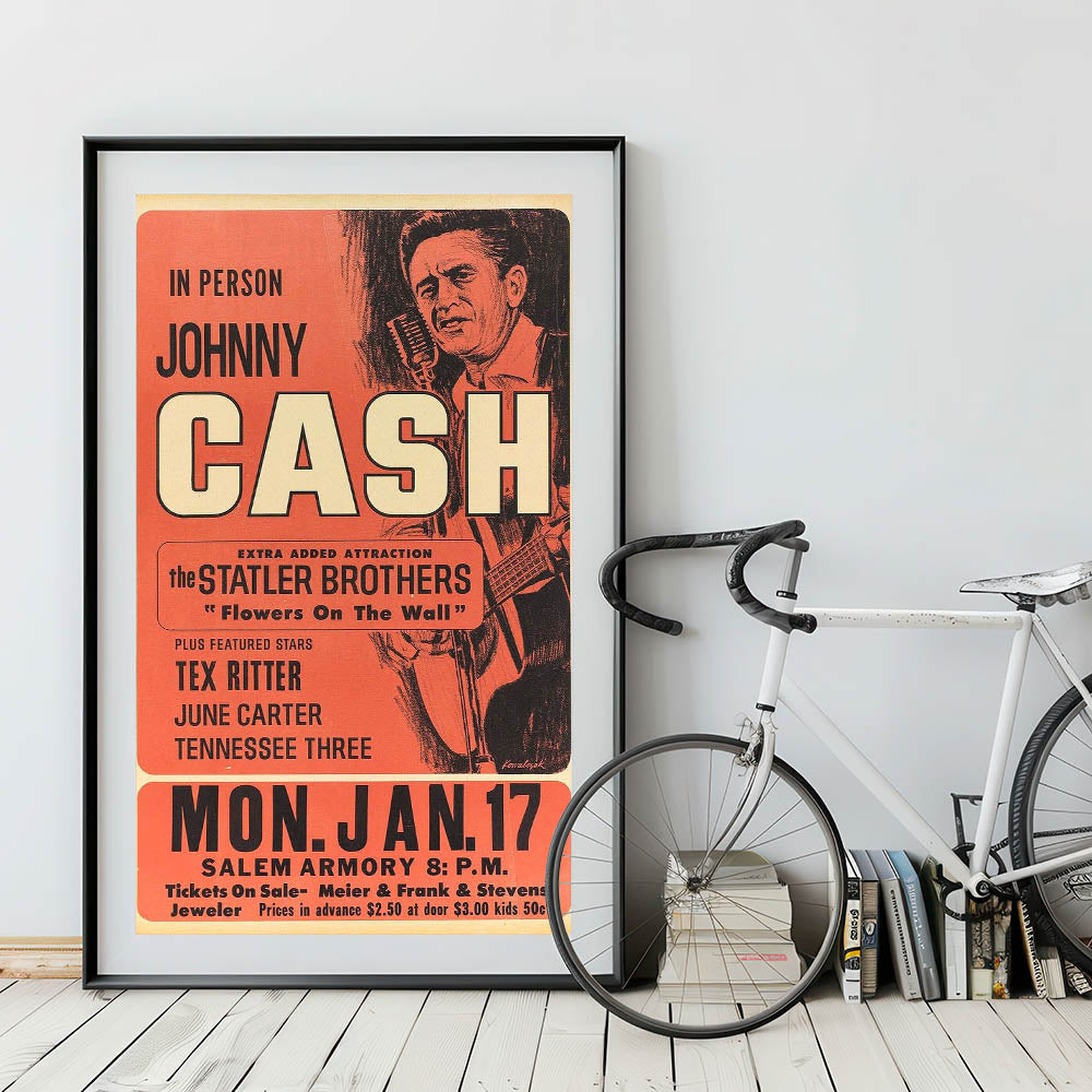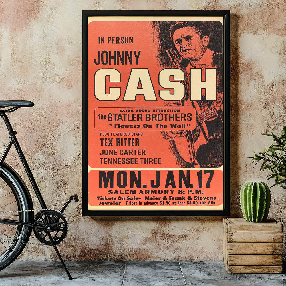 Celebrate the legacy of Johnny Cash with this vintage decor poster featuring a retro aesthetic that captures the raw energy of his legendary performances. Designed with a classic retro style, this nostalgic art print showcases an iconic concert advertisement, making it a must-have for country music lovers and collectors of timeless retro designs.