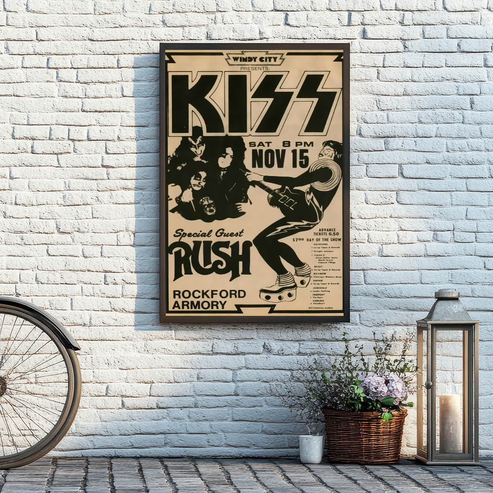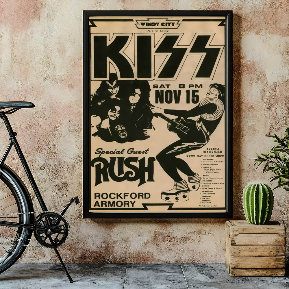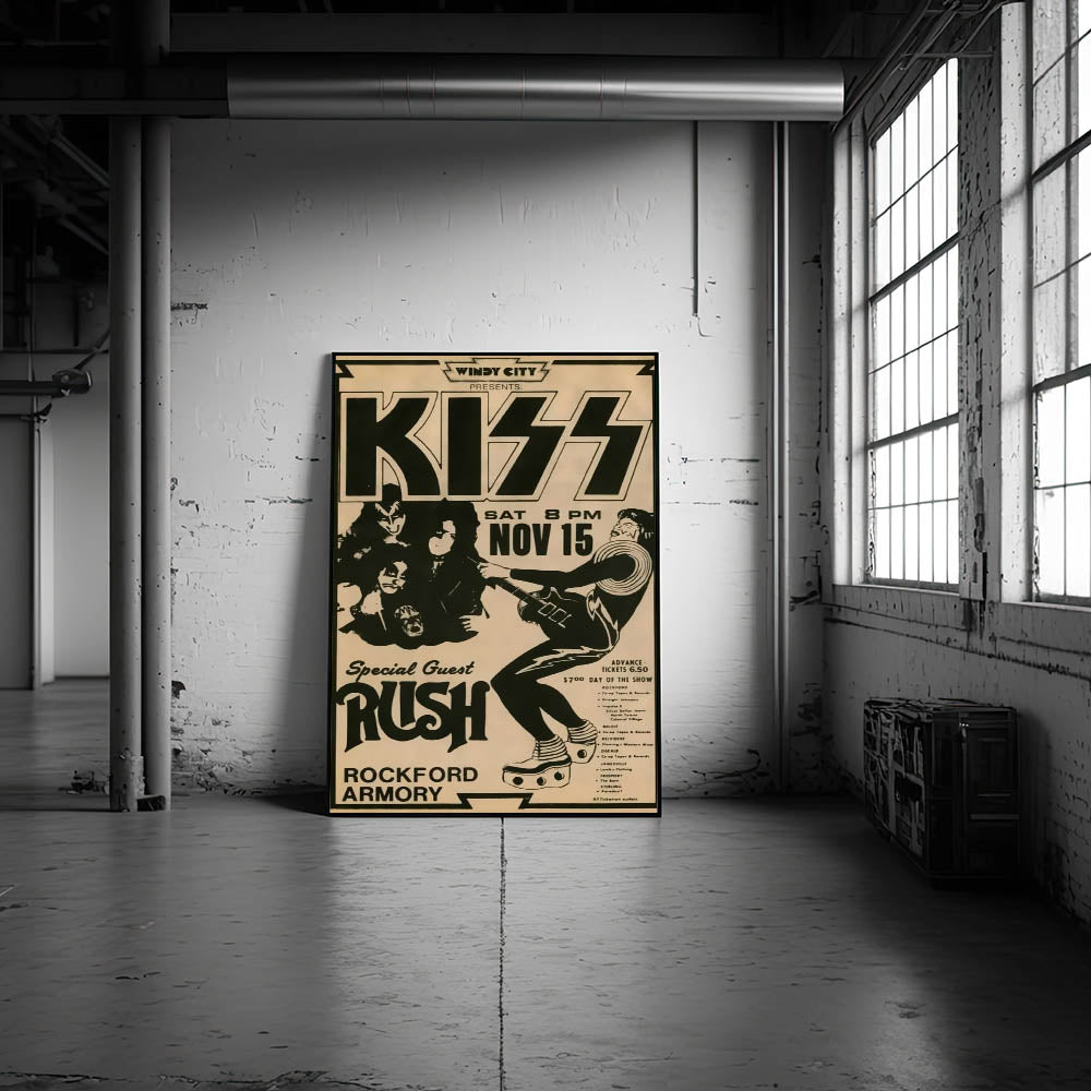 This retro wall decor pays homage to the legendary rock performances of KISS and Rush, making it an essential vintage print for fans of 70s and 80s rock. Whether you're a collector of retro canvas prints or looking to add a bold statement piece to your space, this poster is a must-have.