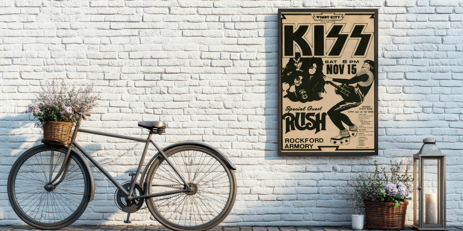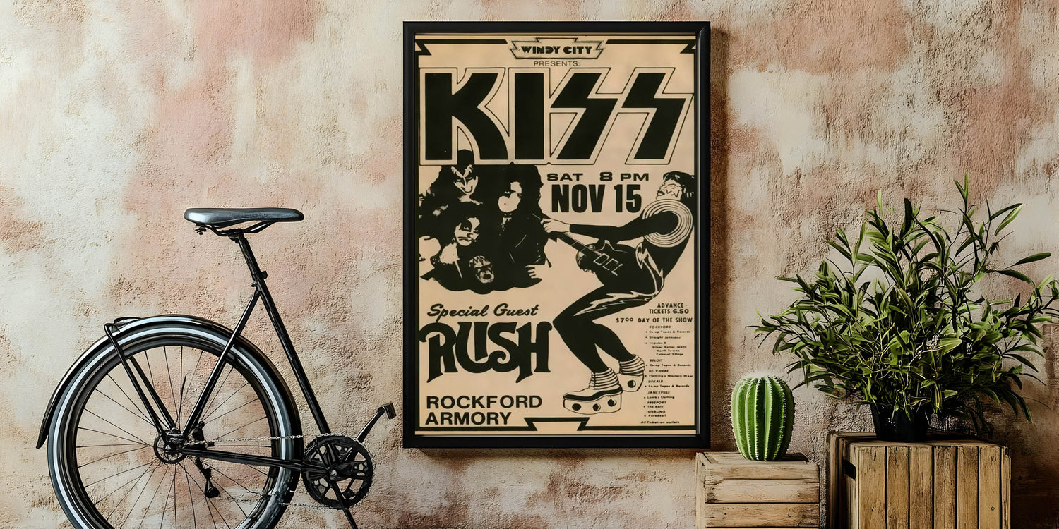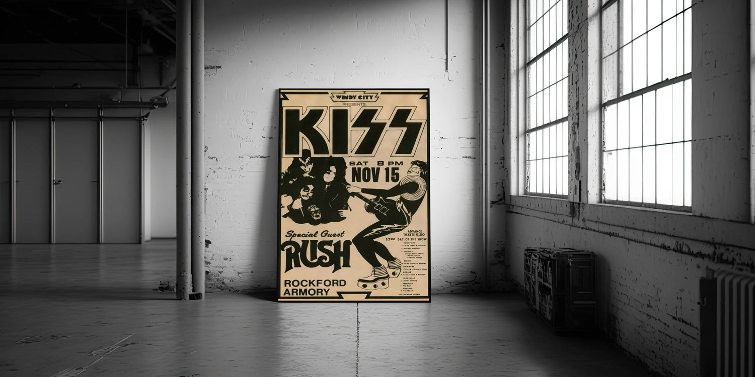 This retro wall decor pays homage to the legendary rock performances of KISS and Rush, making it an essential vintage print for fans of 70s and 80s rock. Whether you're a collector of retro canvas prints or looking to add a bold statement piece to your space, this poster is a must-have.