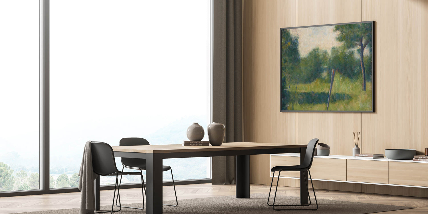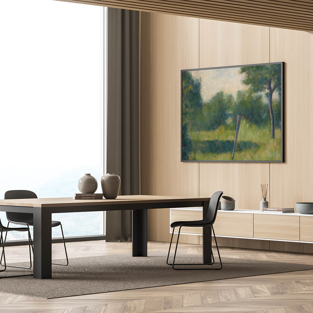 This artwork’s palette of deep greens and soft neutrals brings a touch of serenity and sophistication to your decor. Seurat’s Impressionist style captures the essence of a peaceful landscape, making it a timeless addition to both modern and traditional spaces.