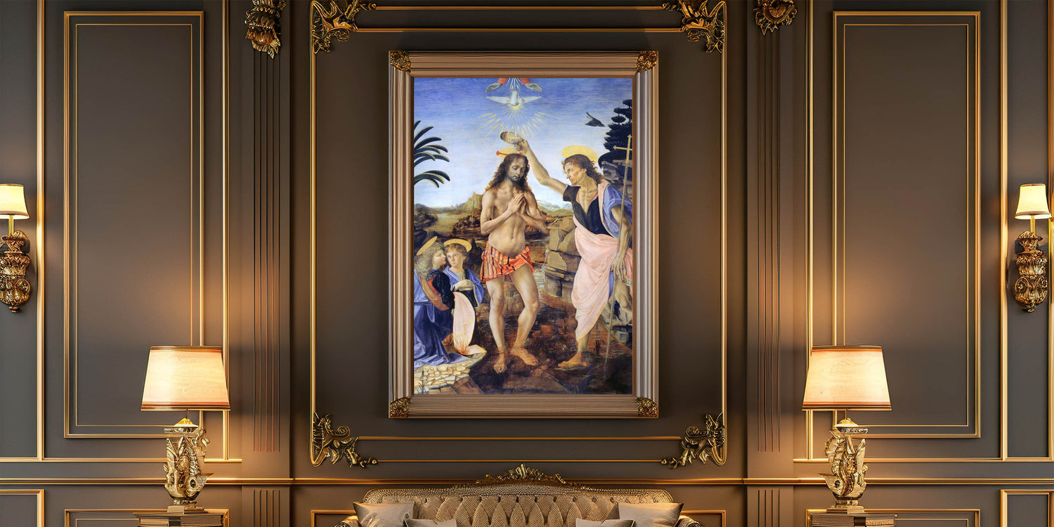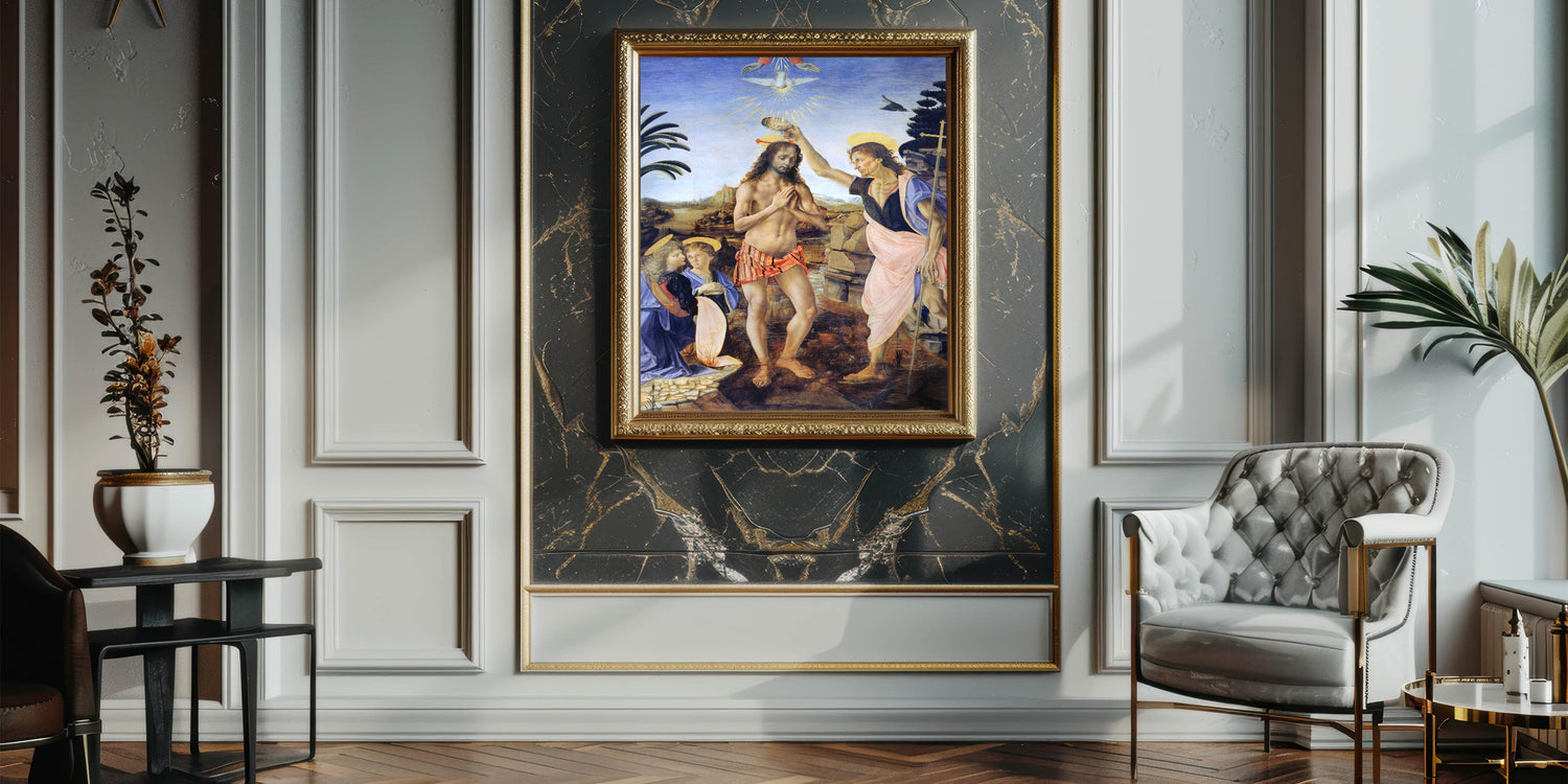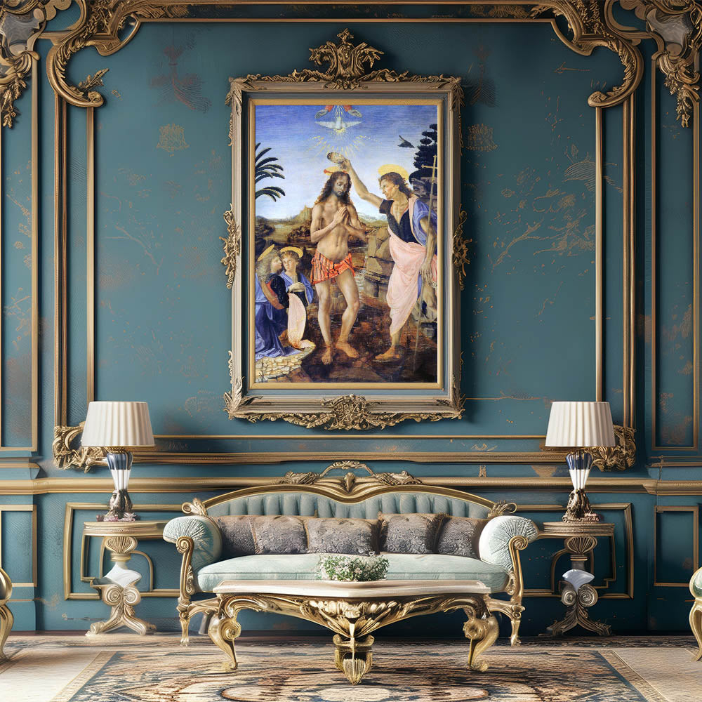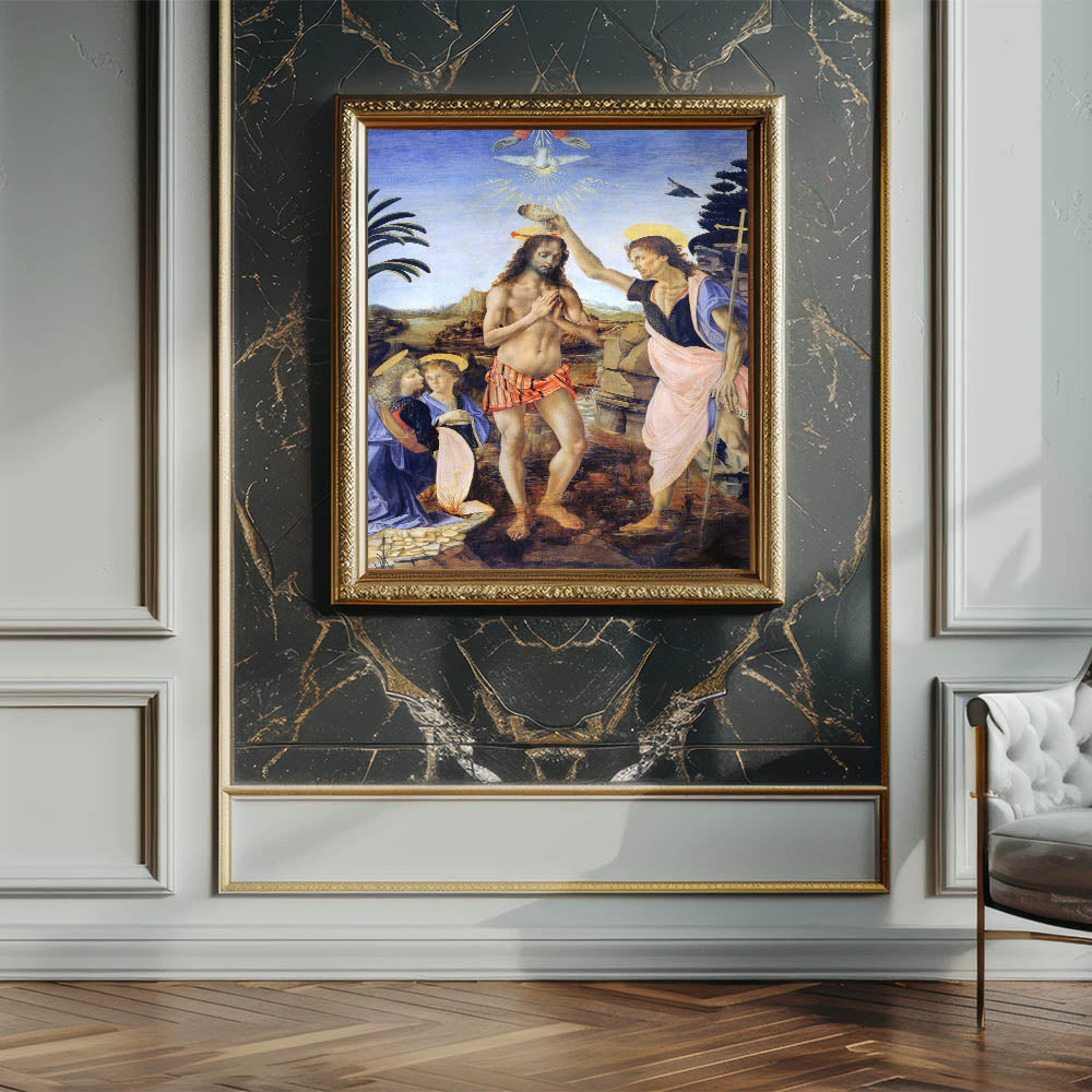 Transform your decor with The Baptism of Christ, a breathtaking Renaissance masterpiece attributed to Leonardo da Vinci and Andrea del Verrocchio. This artwork depicts the sacred moment when John the Baptist baptizes Jesus, with divine light radiating from the Holy Spirit above. The intricate details, luminous colors, and emotional depth reflect the genius of Leonardo’s early work, combined with Verrocchio’s masterful technique.
