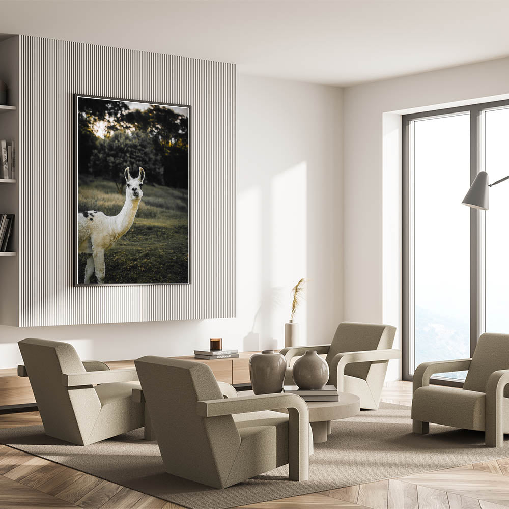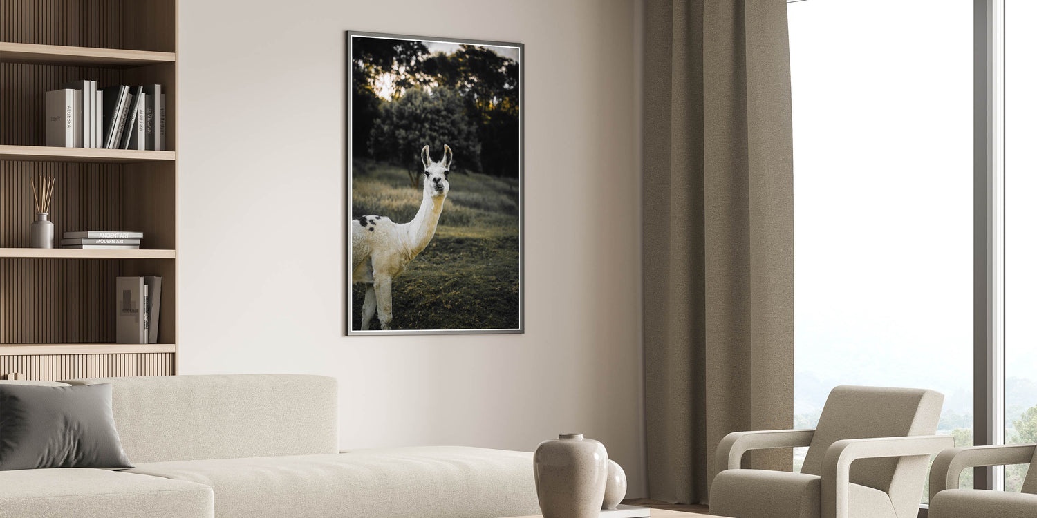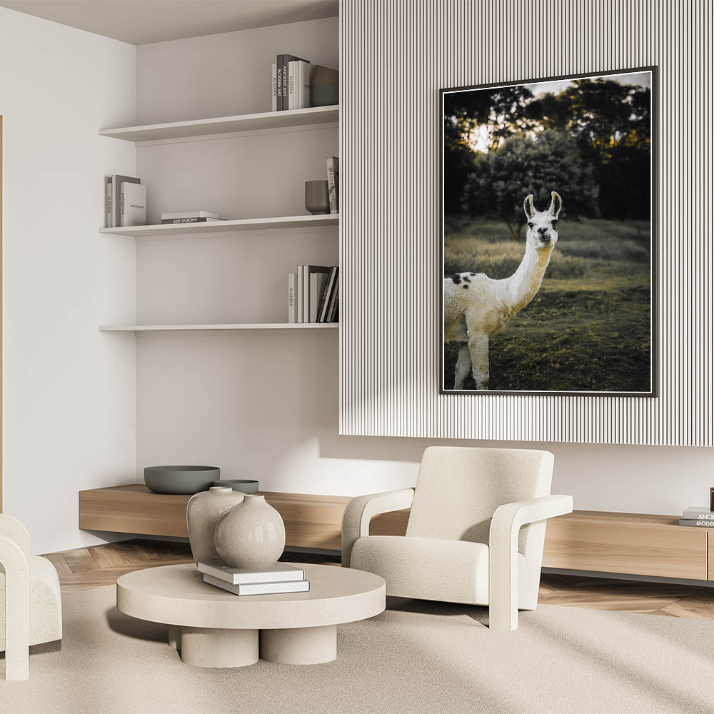 This charming llama portrait brings a touch of rustic farm life into your home, adding warmth and personality to any space. Captured in a serene natural setting, the llama’s curious expression and the earthy tones of the background create a tranquil atmosphere. This piece is perfect for those looking to enhance their farmhouse-style decor with a unique, nature-inspired artwork.