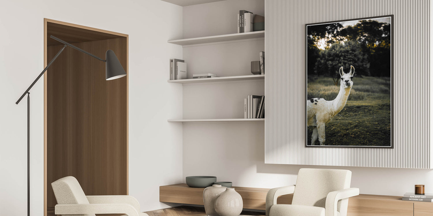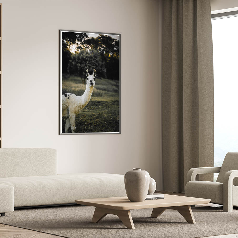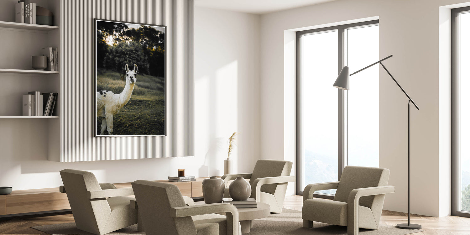 This charming llama portrait brings a touch of rustic farm life into your home, adding warmth and personality to any space. Captured in a serene natural setting, the llama’s curious expression and the earthy tones of the background create a tranquil atmosphere. This piece is perfect for those looking to enhance their farmhouse-style decor with a unique, nature-inspired artwork.