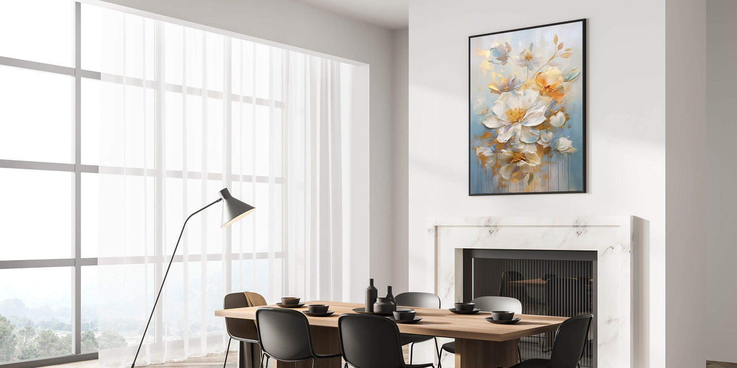Bring elegance and luxury to your home with this stunning floral glam wall art. Featuring soft white and pastel flowers accented with shimmering gold, this artwork exudes sophistication and grace. The intricate detailing and textured brushstrokes bring a sense of depth and movement to the piece, creating an opulent visual experience perfect for modern glam decor.