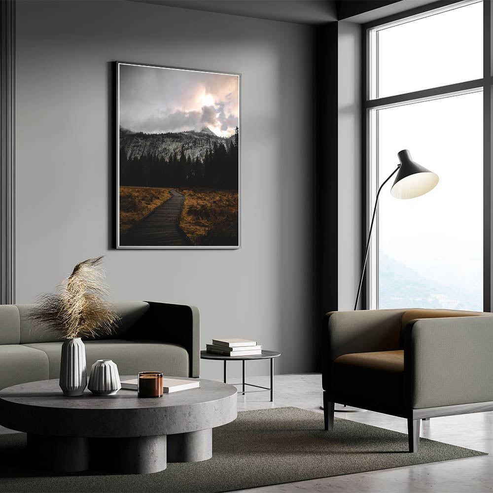 Immerse yourself in the tranquility of nature with our Majestic Mountain Landscape Wall Art. This piece beautifully captures a serene mountain vista shrouded in mist, complemented by a rustic wooden pathway leading through a golden meadow. It’s an invitation to wander and reflect, making it a perfect addition to any space seeking a touch of calm and inspiration.