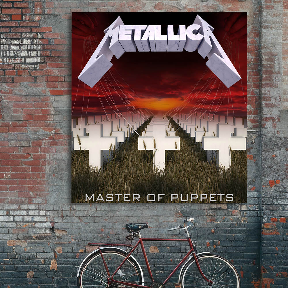 Elevate your space with this Metallica "Master of Puppets" Retro Wall Art, a tribute to one of the most legendary heavy metal albums of all time. This striking print features the iconic battlefield of white crosses, illuminated by a haunting red and orange sunset, with puppet strings looming from above. A must-have for Metallica fans and lovers of classic rock aesthetics.
