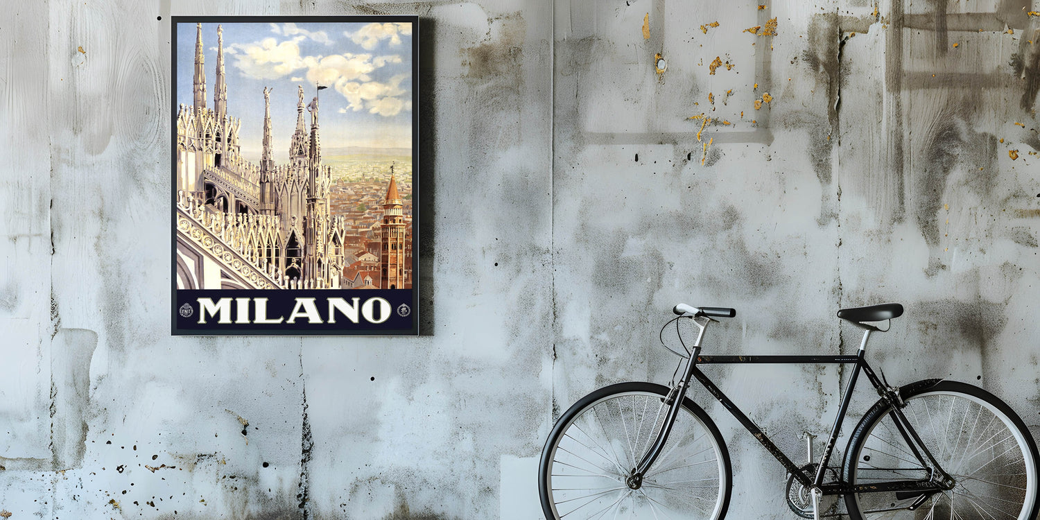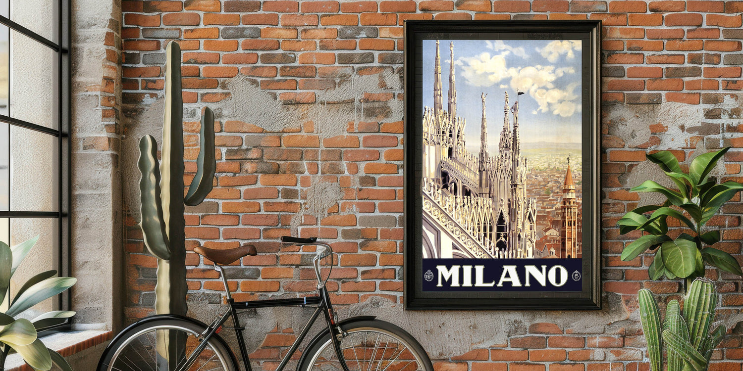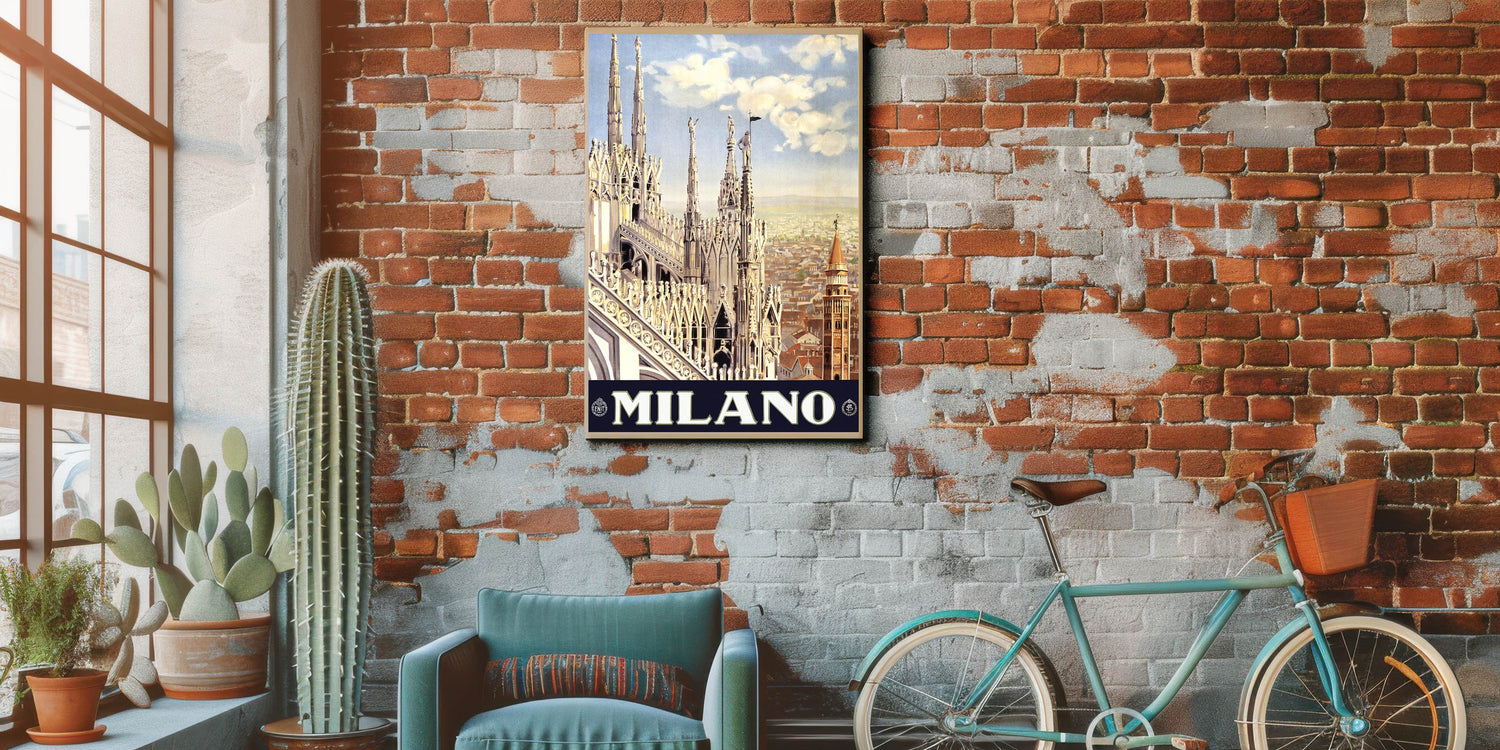 Add a timeless touch to your space with this Milan vintage travel poster. Its detailed architecture and warm hues create a sophisticated ambiance, blending effortlessly with various interior styles.