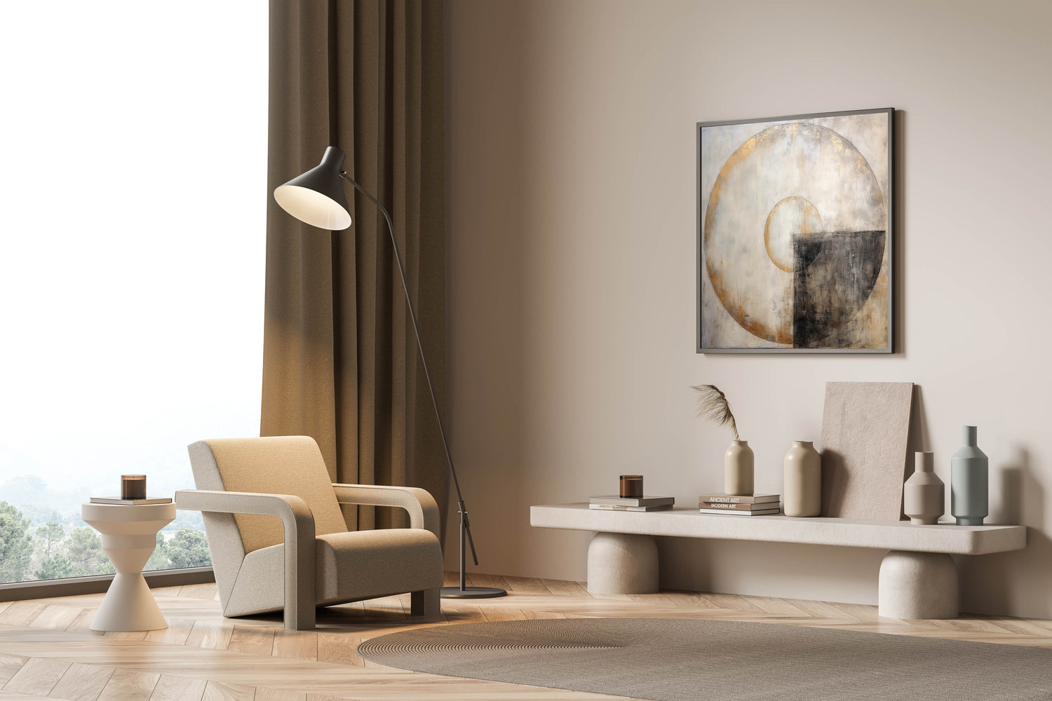 - Minimalist design with bold geometric elements and a sophisticated, neutral palette.