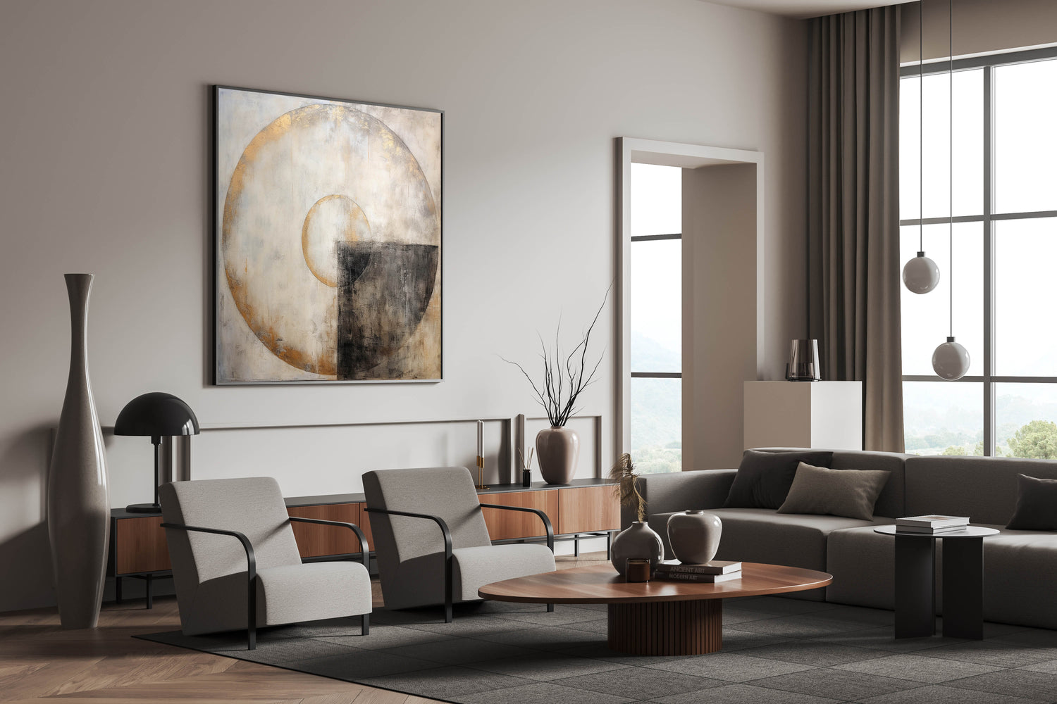 Minimalist Abstract Art - Gold and Gray Circular Geometric Design