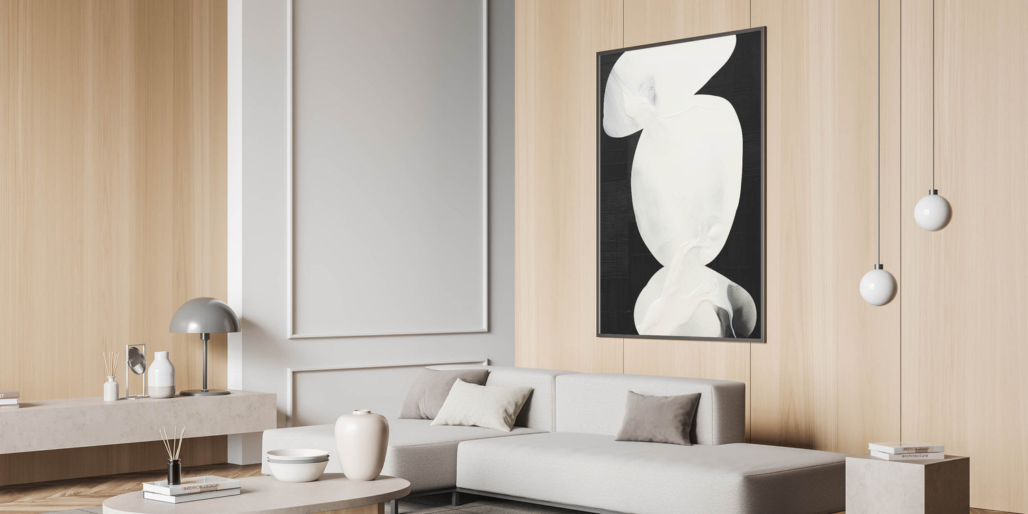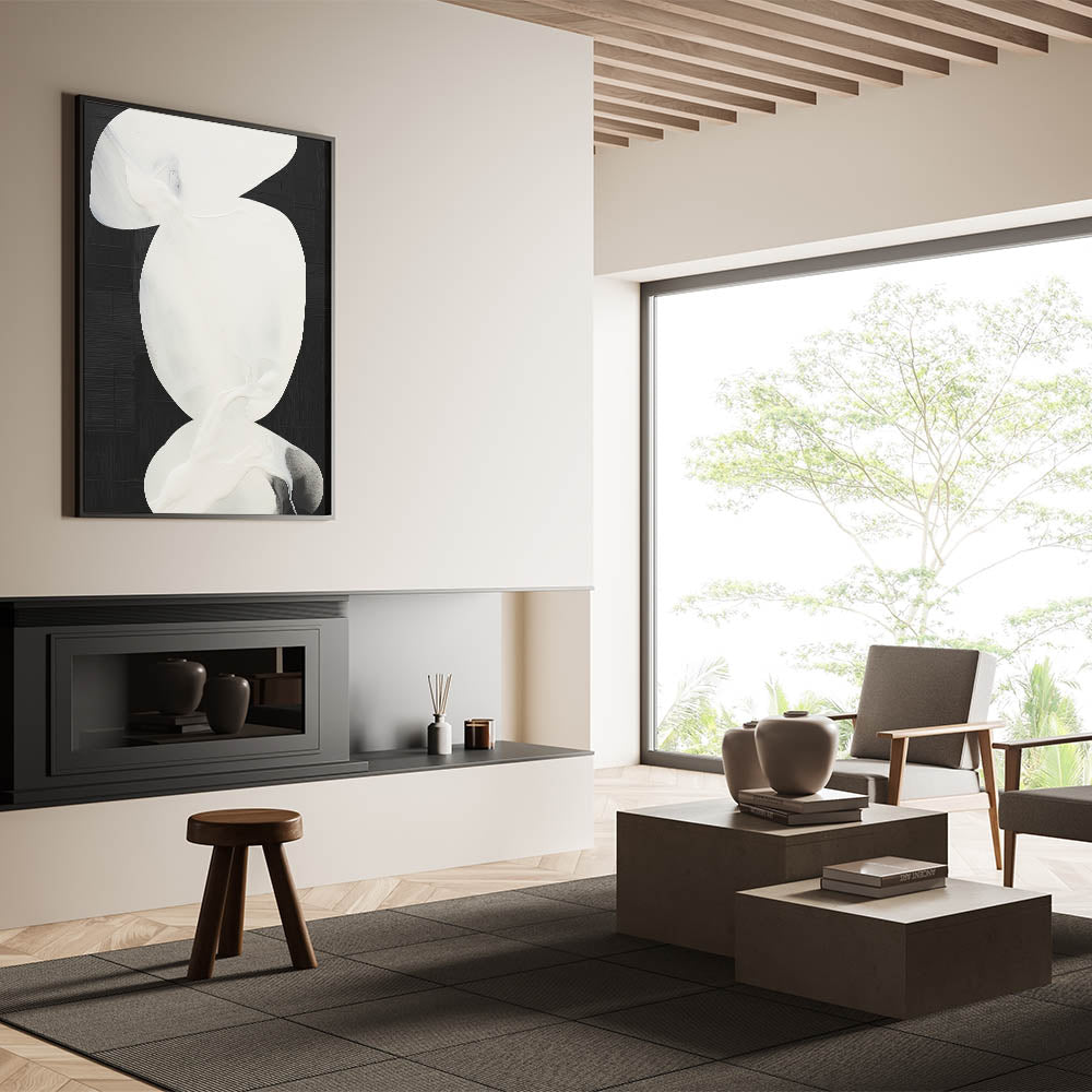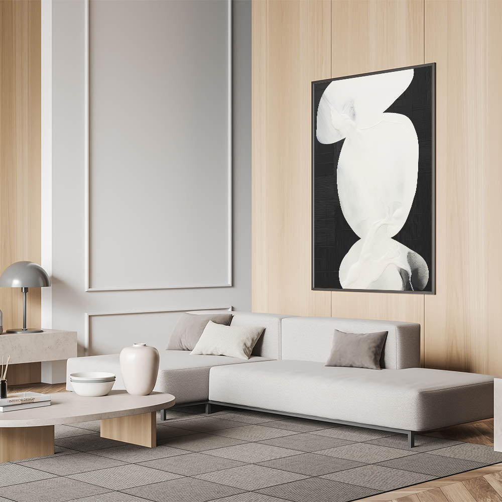 Make a bold statement with this minimalist abstract art piece in black and white. Featuring fluid, organic shapes in soft white tones against a striking black background, this artwork exudes elegance and simplicity. The high-contrast design makes it perfect for contemporary and minimalist interiors, creating a sophisticated focal point that enhances any space with modern flair.