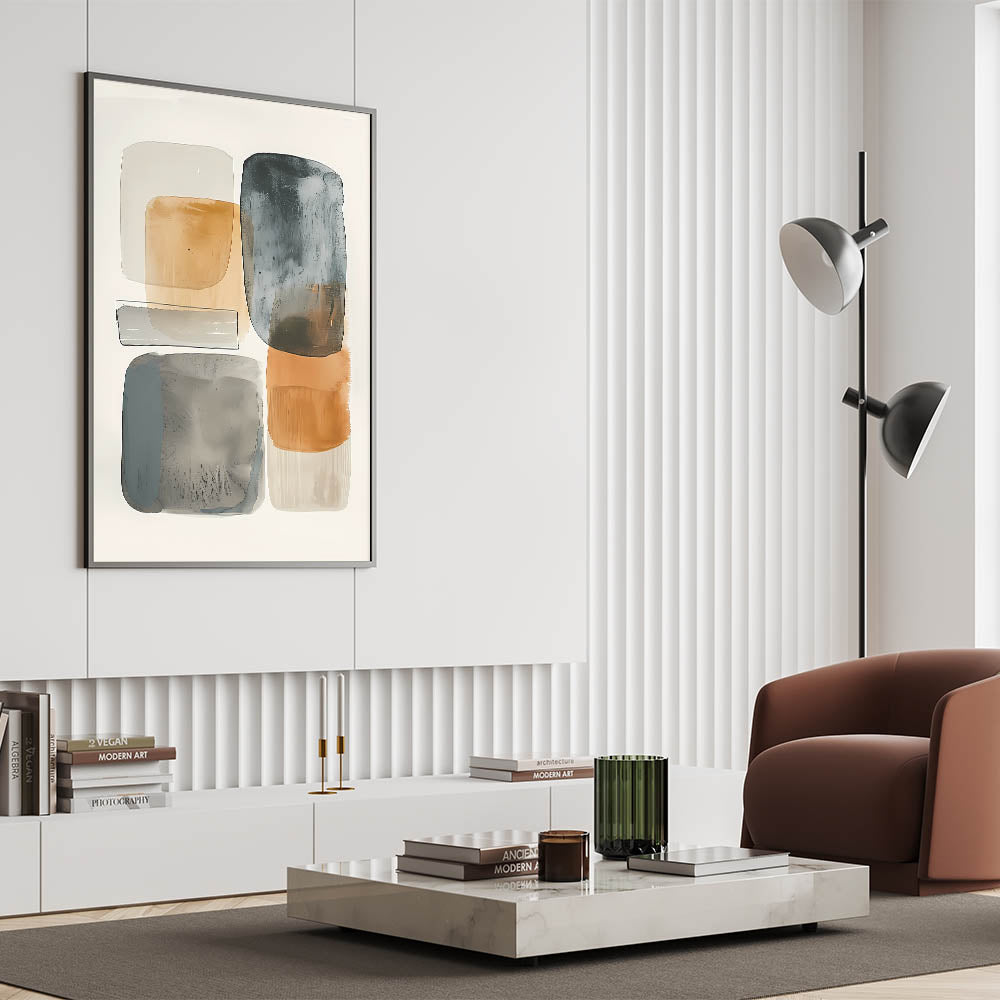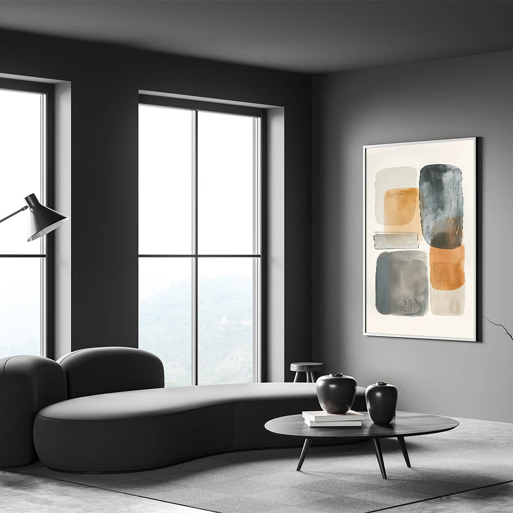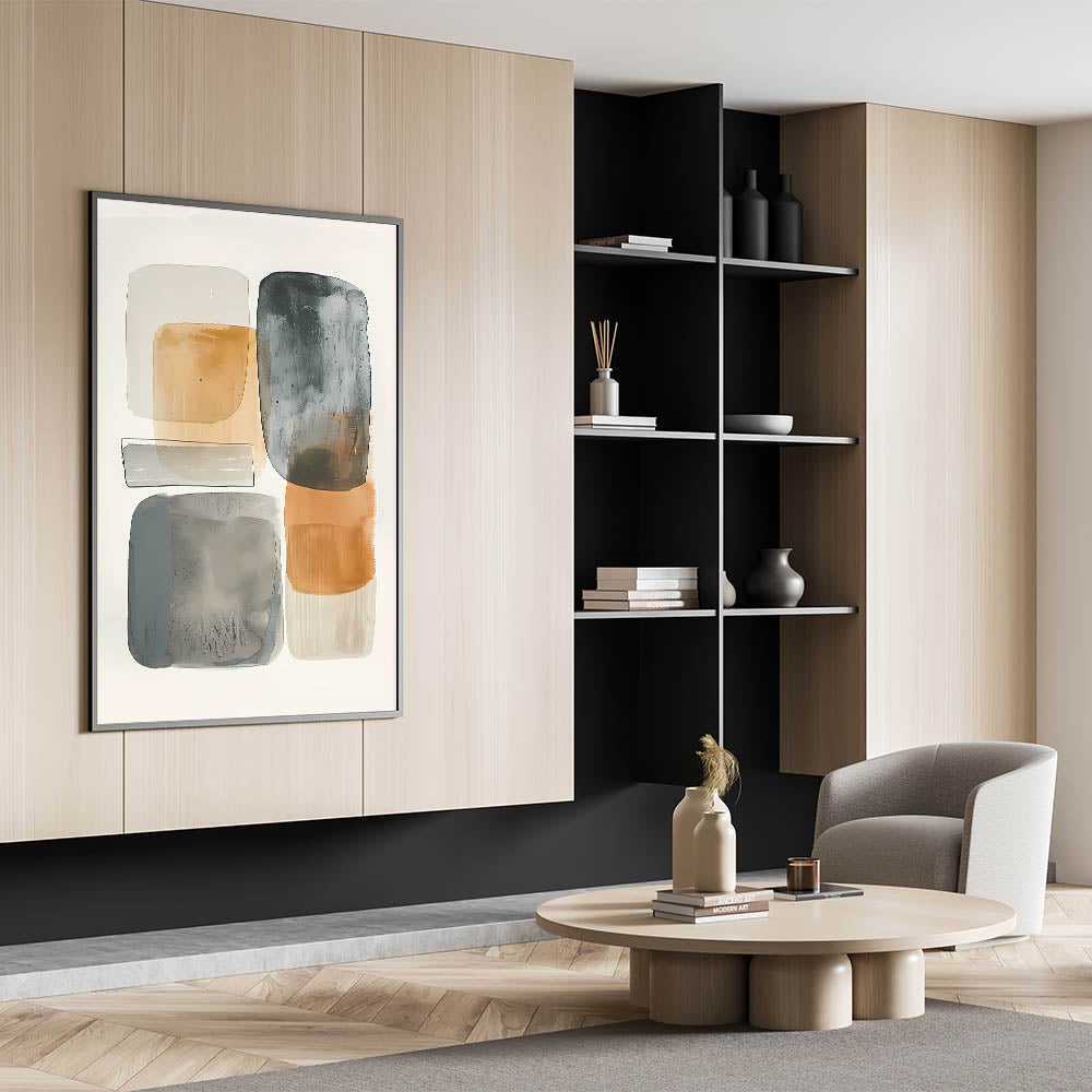 Bring warmth and modern style to your space with this minimalist abstract artwork in earthy tones. The design features layered geometric shapes in shades of orange, gray, and beige, creating a balanced and harmonious composition. Perfect for contemporary and minimalist interiors, this piece adds a subtle yet sophisticated touch to any room. Its natural color palette makes it an inviting addition, bringing a cozy and grounded atmosphere.