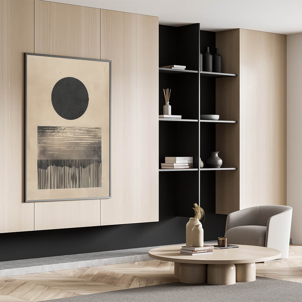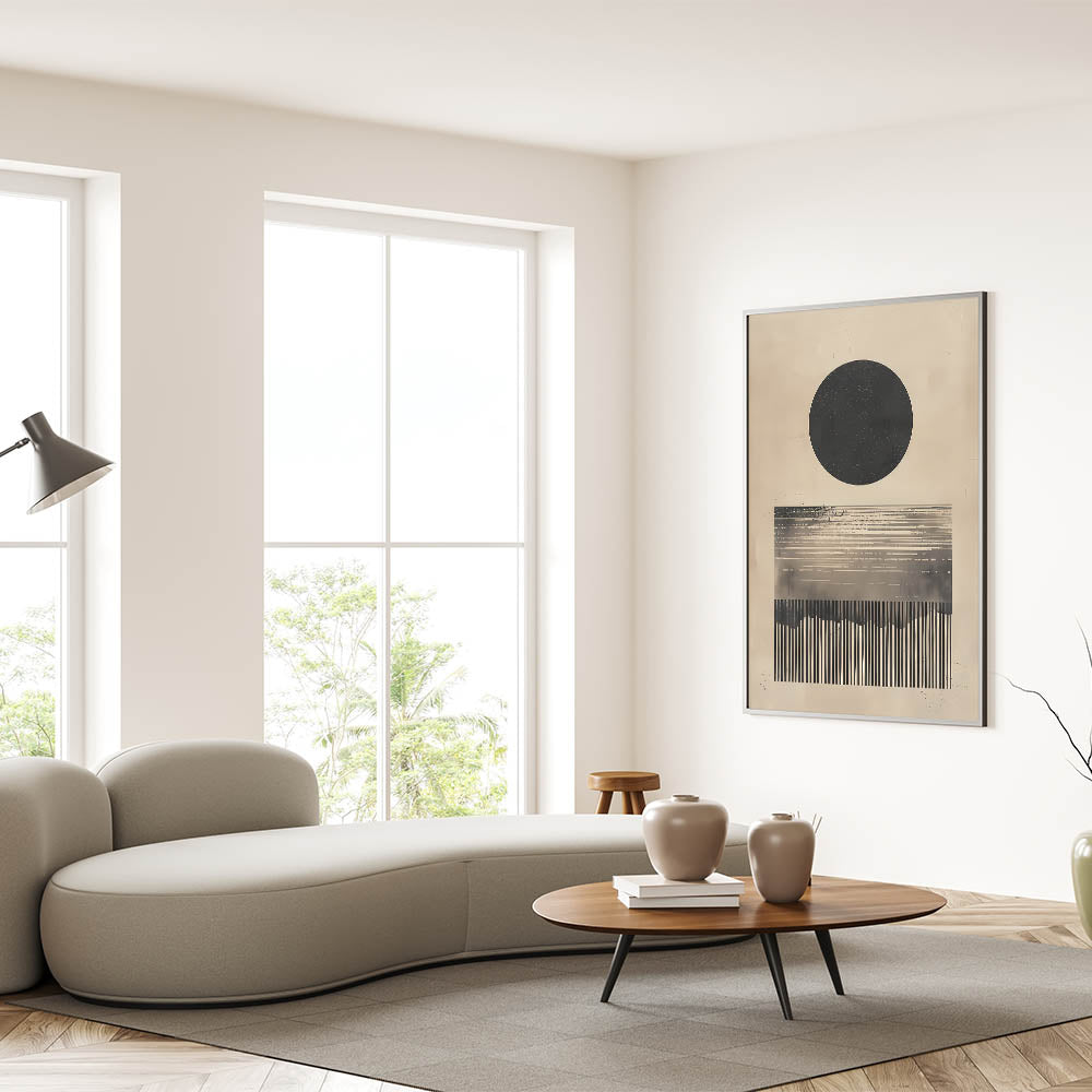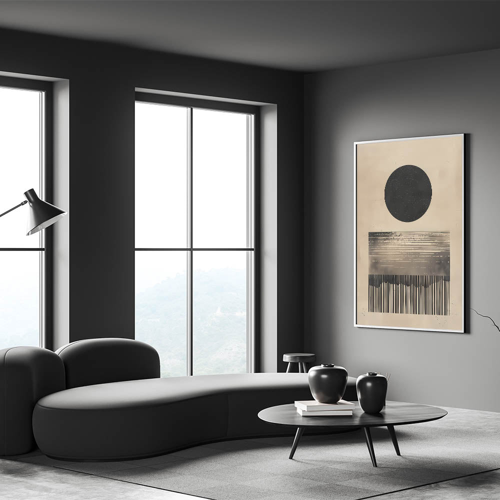 Introduce a bold and intriguing touch to your space with this minimalist abstract artwork featuring a large black circle and linear design elements in neutral beige tones. The geometric forms create a visually striking composition that adds depth and character to any room. Perfect for contemporary and minimalist interiors, this piece brings a sophisticated and modern aesthetic that is both calming and thought-provoking. Its monochromatic palette enhances its versatility, making it suitable for a variety of decor styles.