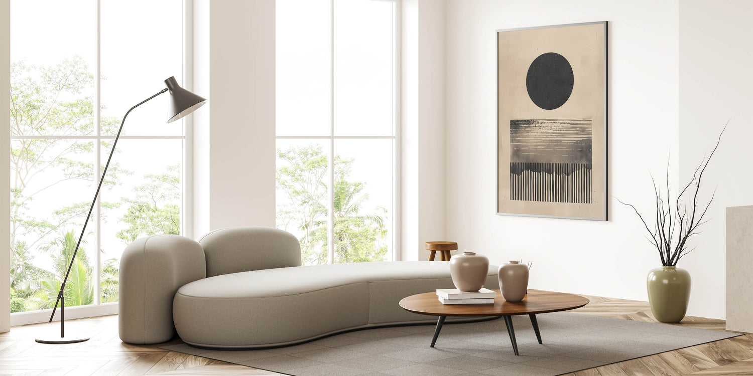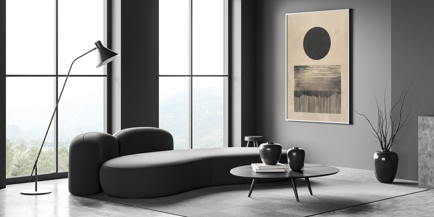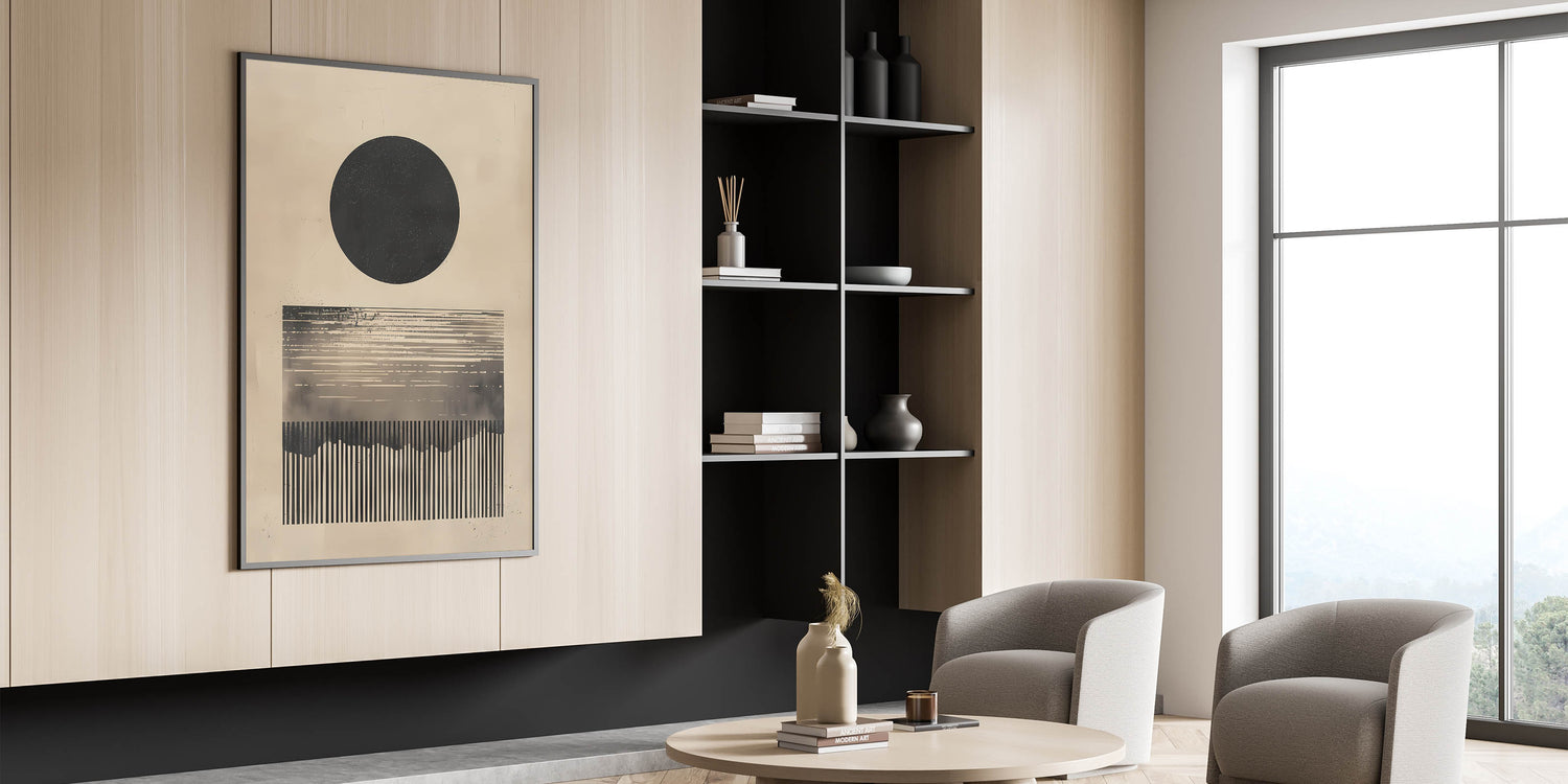 Introduce a bold and intriguing touch to your space with this minimalist abstract artwork featuring a large black circle and linear design elements in neutral beige tones. The geometric forms create a visually striking composition that adds depth and character to any room. Perfect for contemporary and minimalist interiors, this piece brings a sophisticated and modern aesthetic that is both calming and thought-provoking. Its monochromatic palette enhances its versatility, making it suitable for a variety of decor styles.
