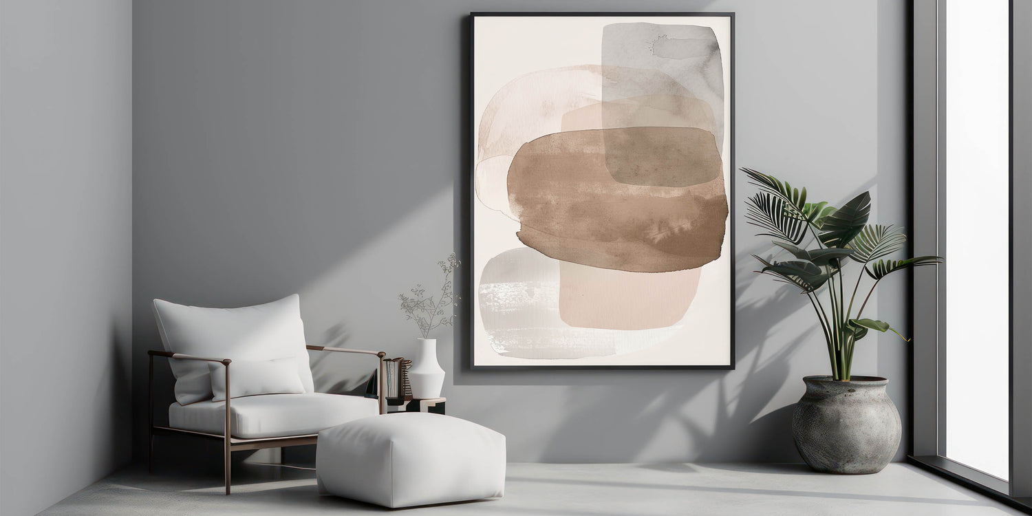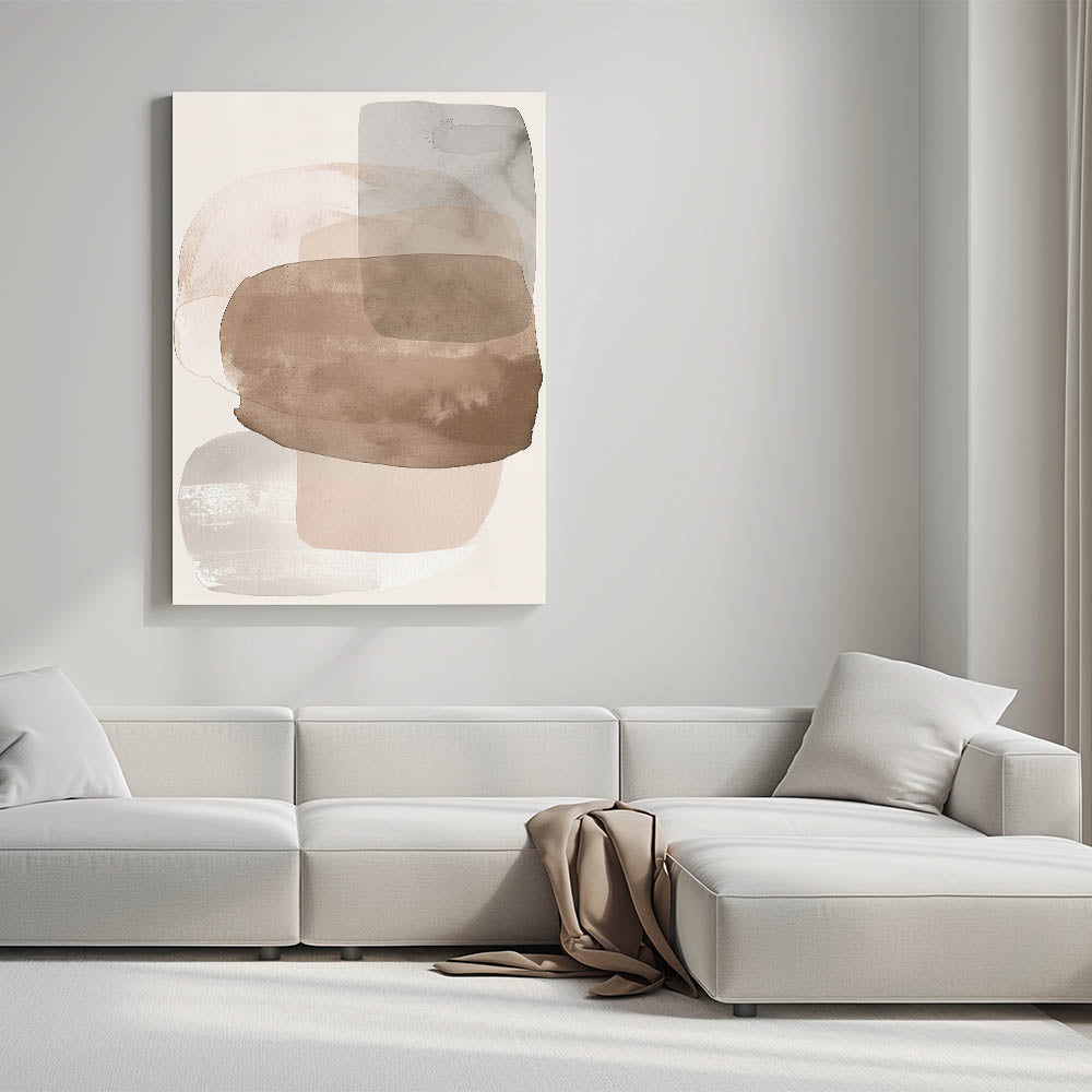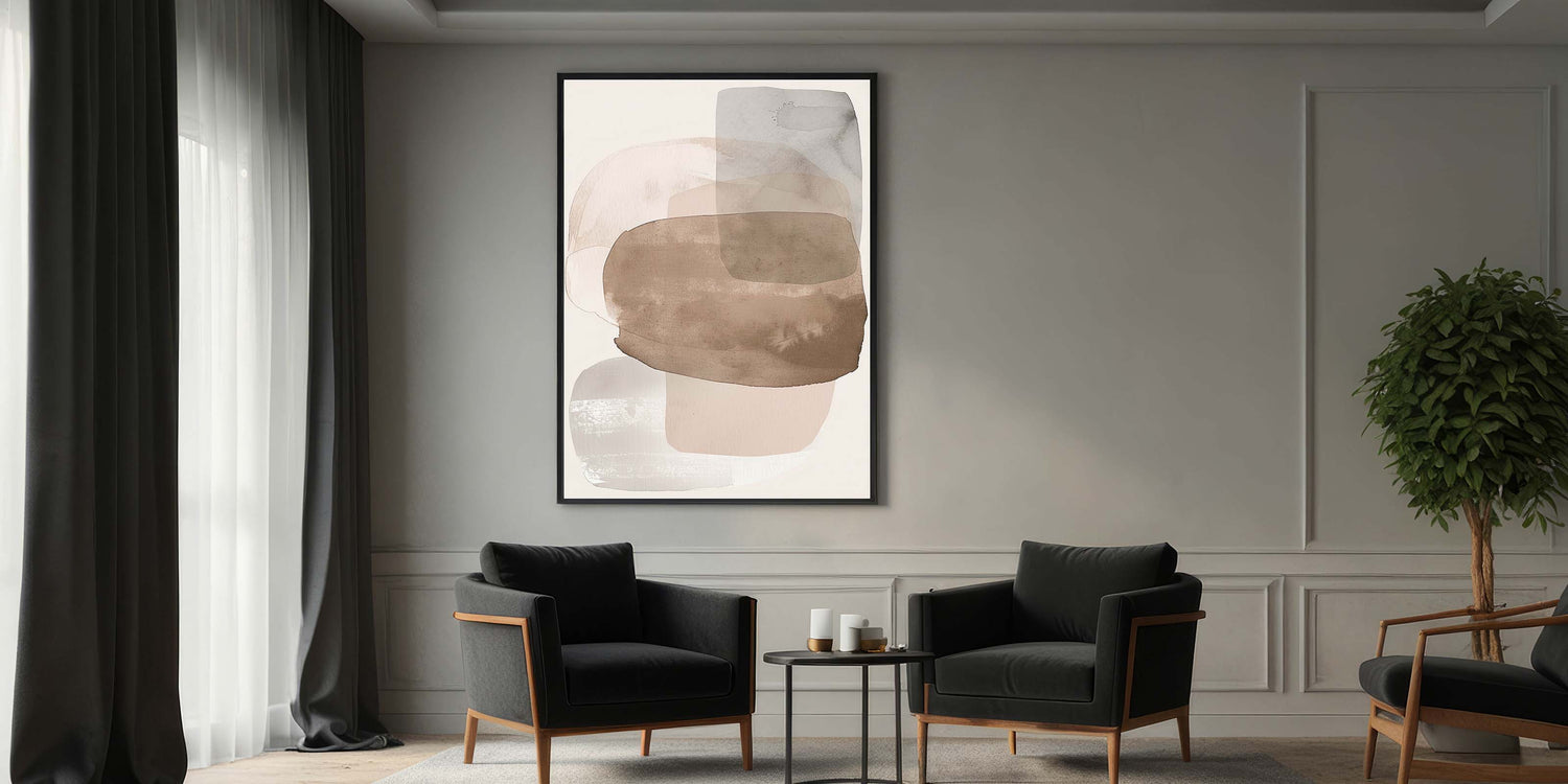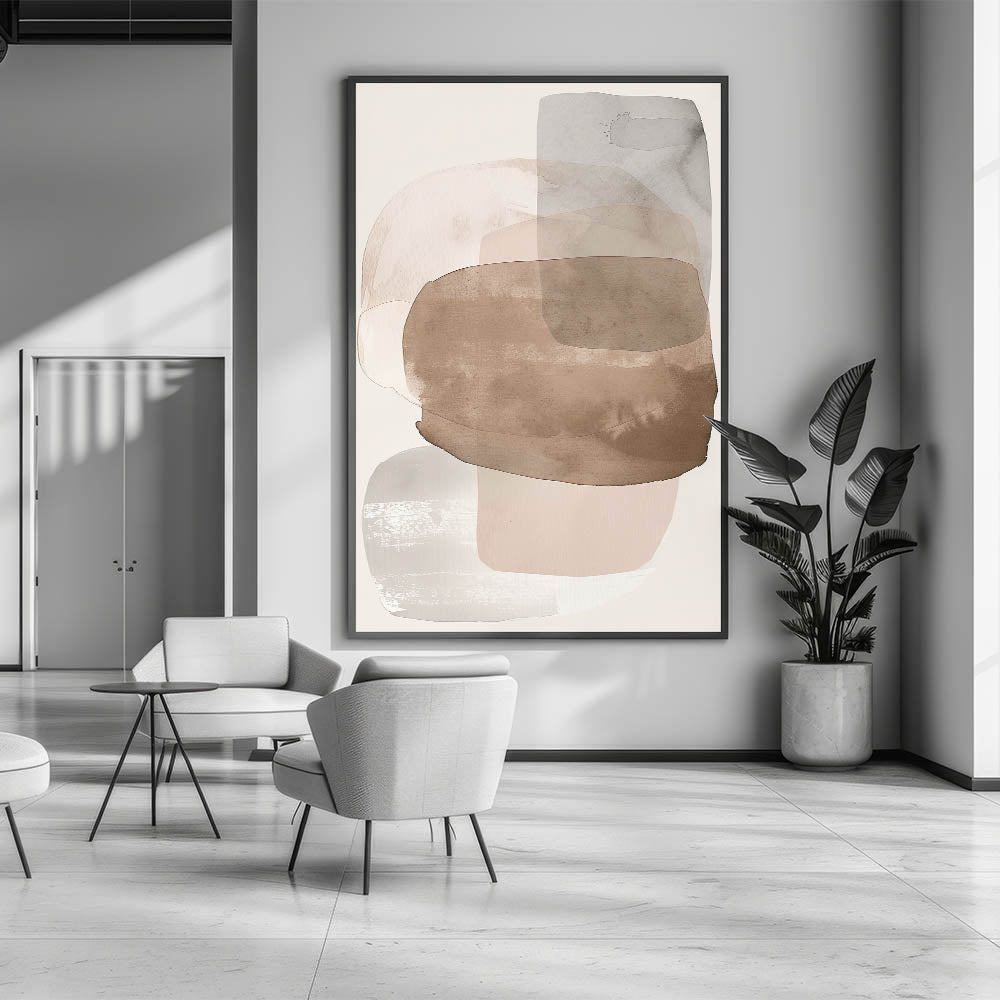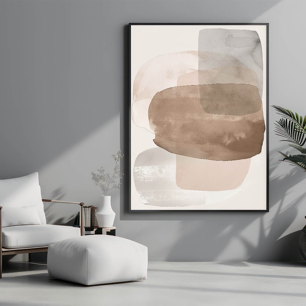 Add soft elegance to your interior with this calming geometric minimalist abstract wall art. Featuring a layered blend of earthy brown, warm beige, and muted gray shapes, this piece embodies a serene, organic aesthetic. It’s an ideal choice for those looking to elevate their space with minimalist wall art for modern interiors while maintaining a warm and welcoming feel.