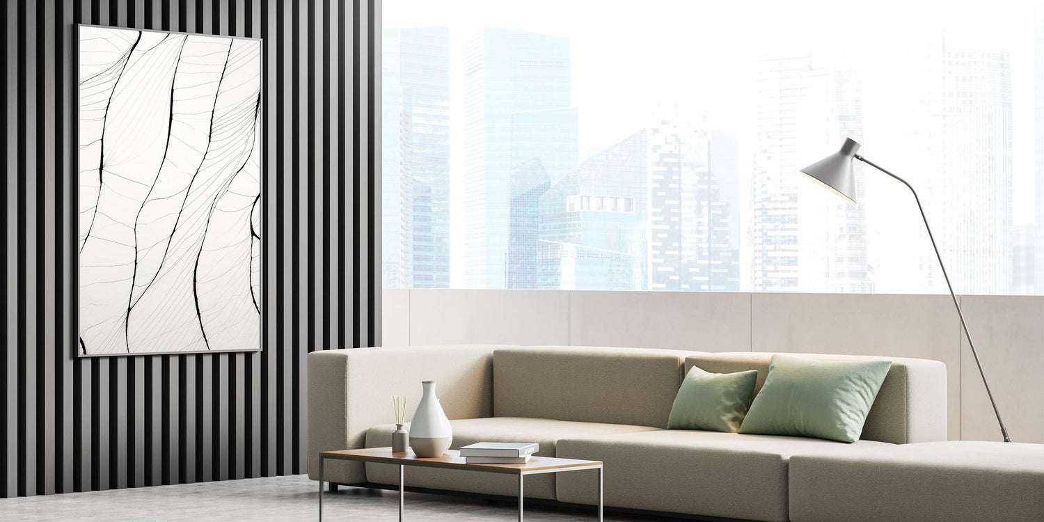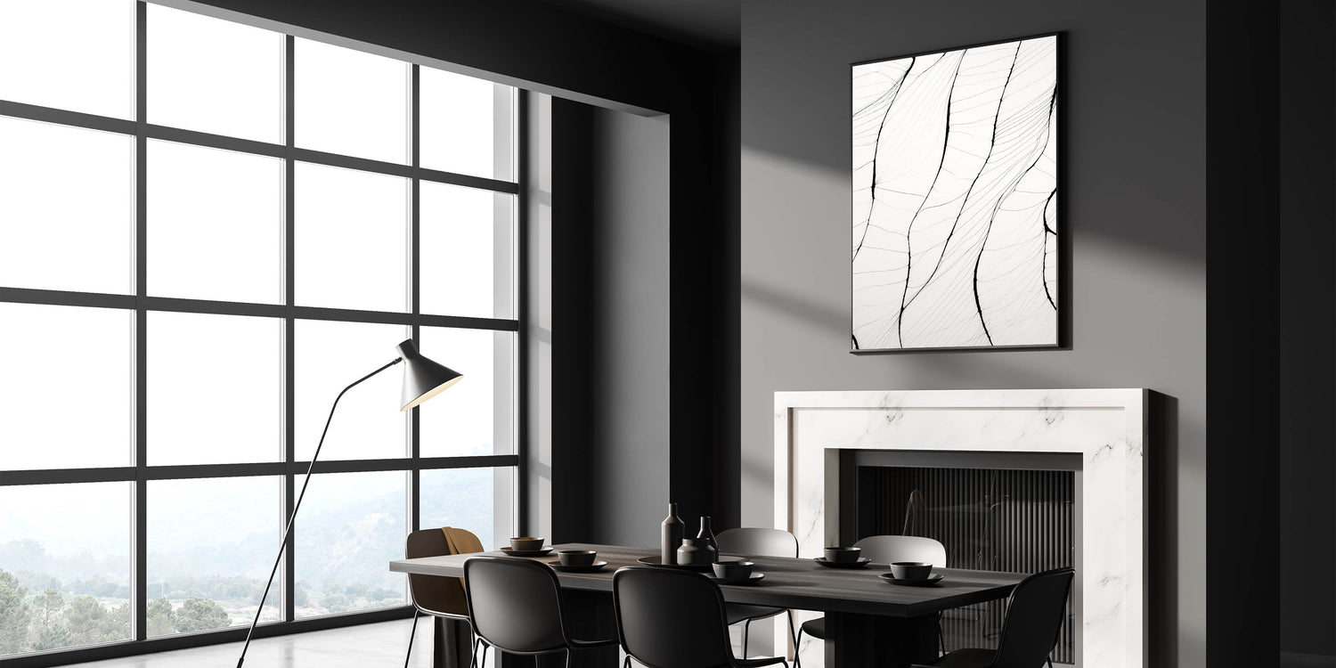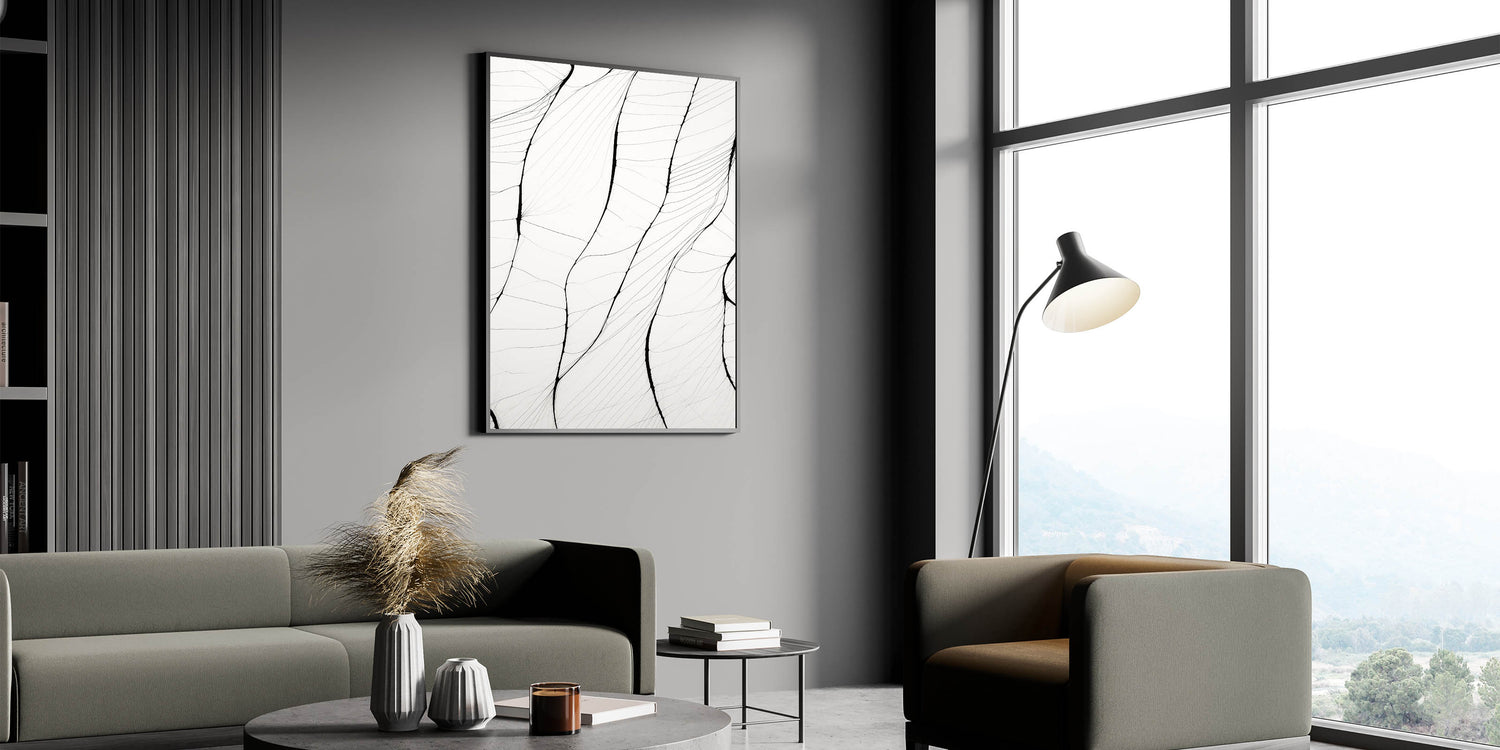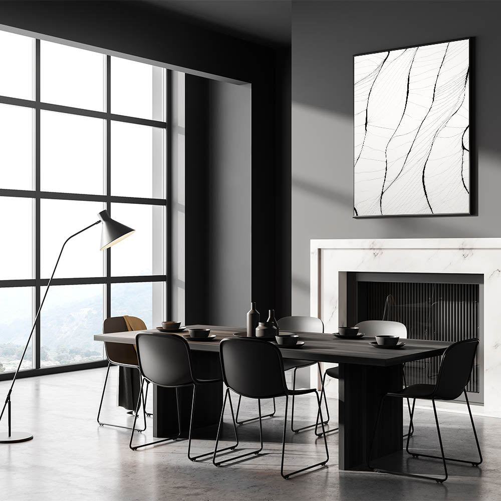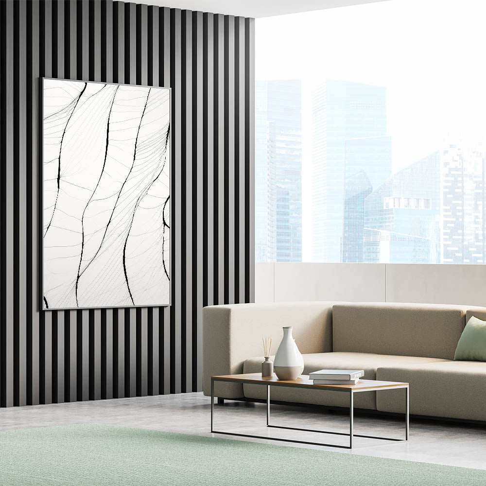 This stunning minimalist wall art showcases a series of delicate, flowing lines that create an intricate organic pattern. The subtlety of the black lines on a white background brings a sophisticated yet serene touch to any room, making it perfect for those who appreciate minimalist art style. This abstract design highlights the beauty of simplicity, offering a modern minimalist art aesthetic for contemporary interiors.