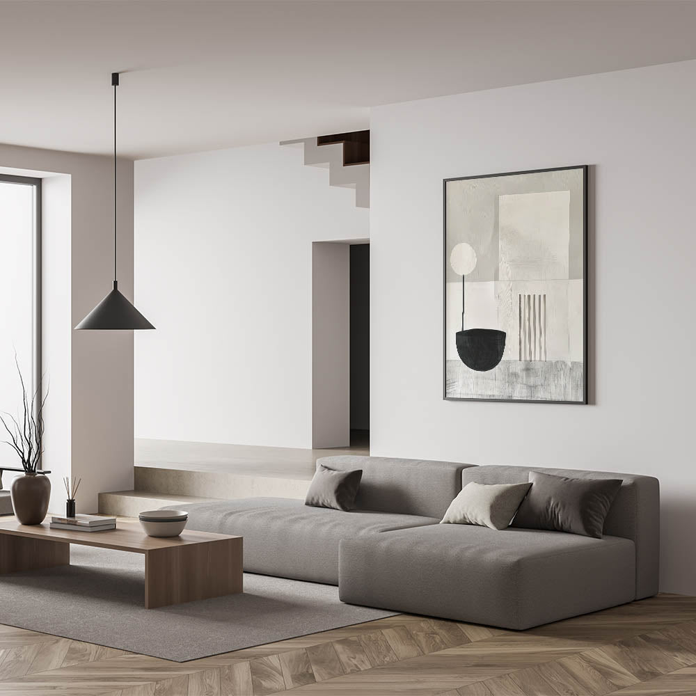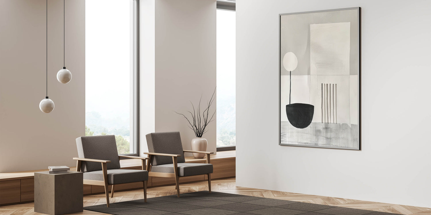 - High-quality minimalist canvas print with a sleek monochrome palette