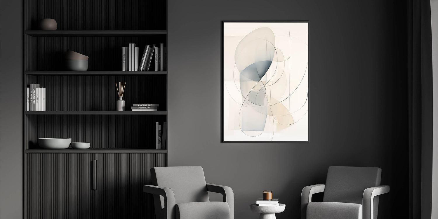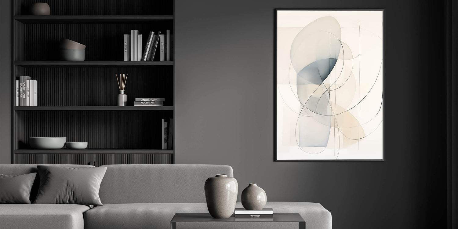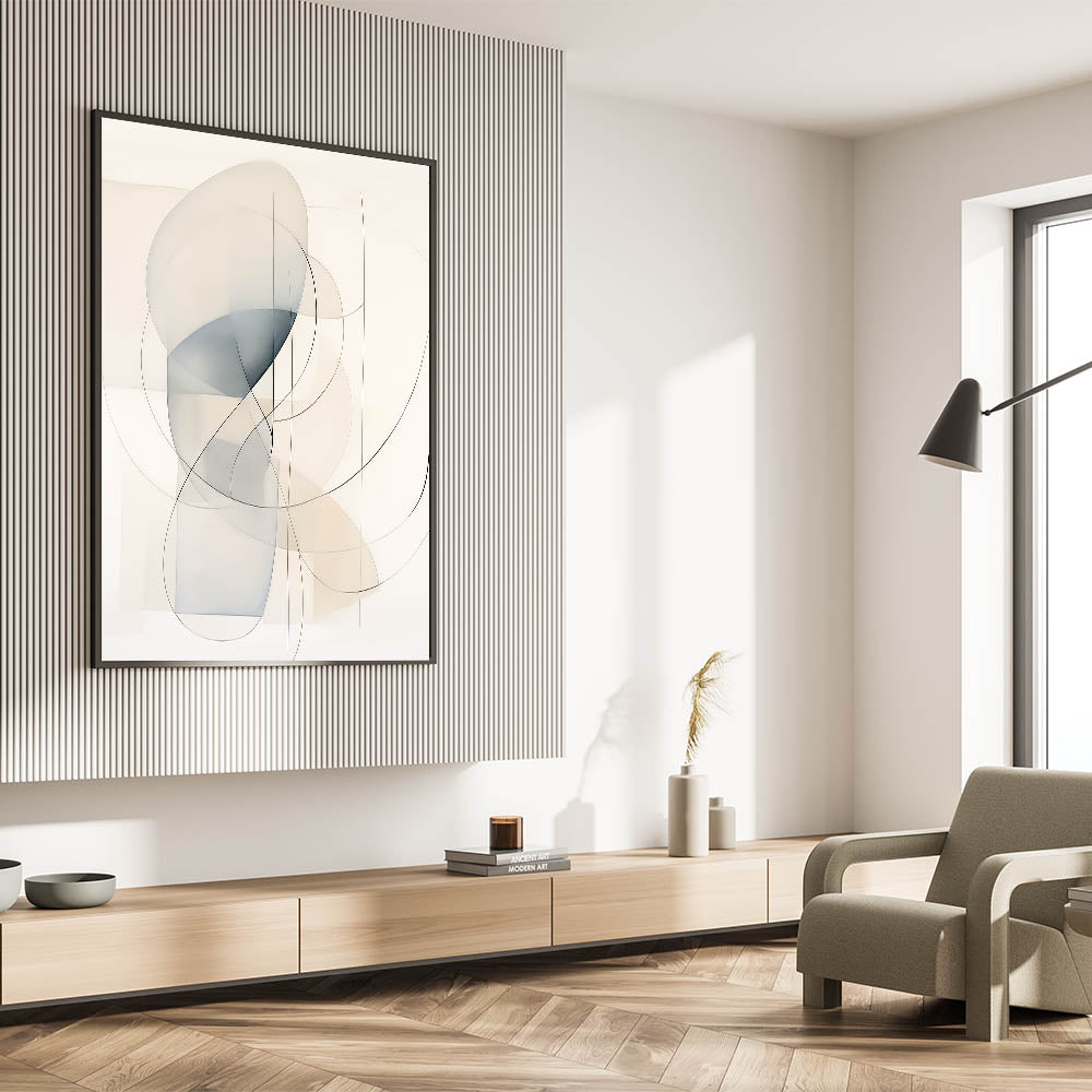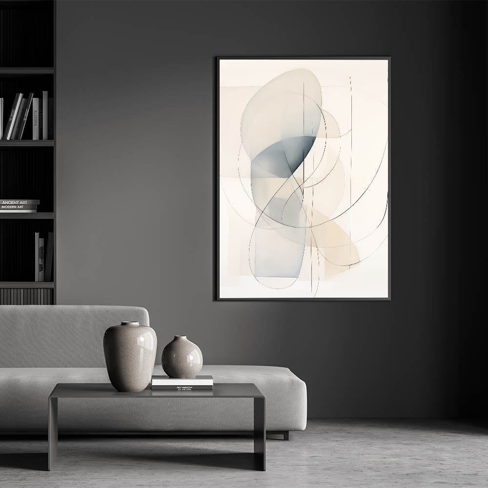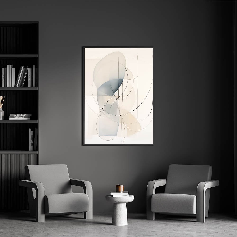 Add a touch of elegance to your space with this minimalist abstract wall art, featuring soft curved lines and translucent shapes in neutral hues. The light tones of beige and blue create a calming, harmonious composition, perfect for modern and minimalist interiors. This piece blends seamlessly into contemporary homes, providing a sophisticated yet serene aesthetic that enhances any living room, bedroom, or office space.