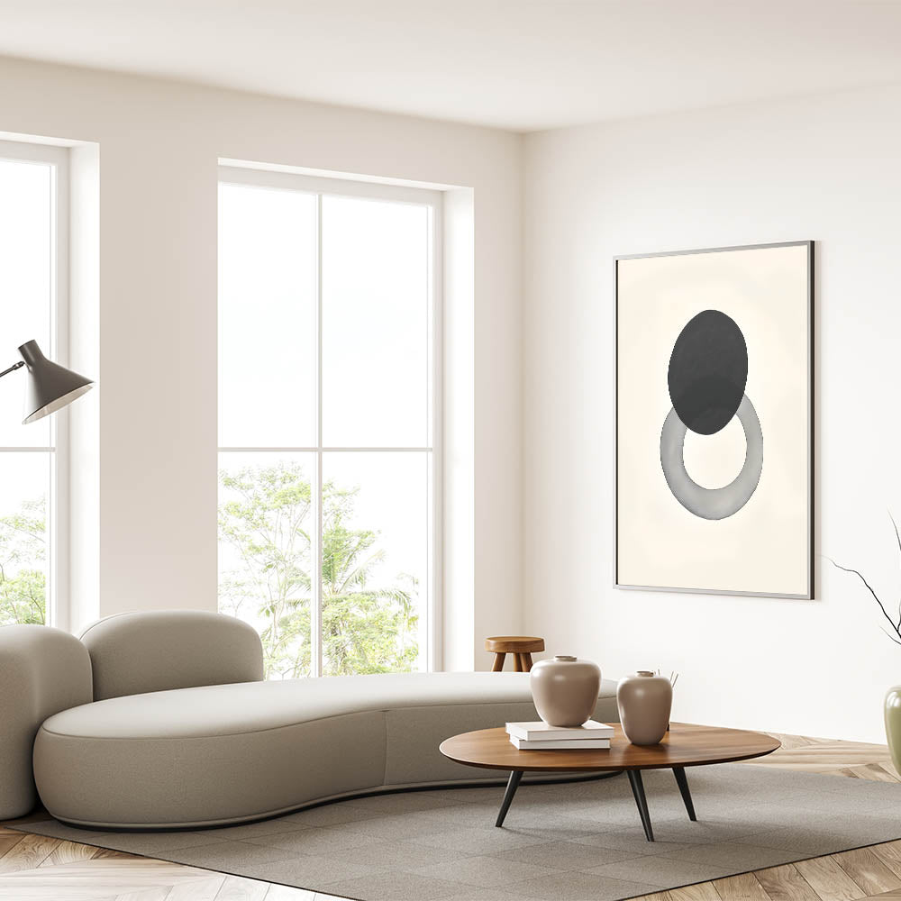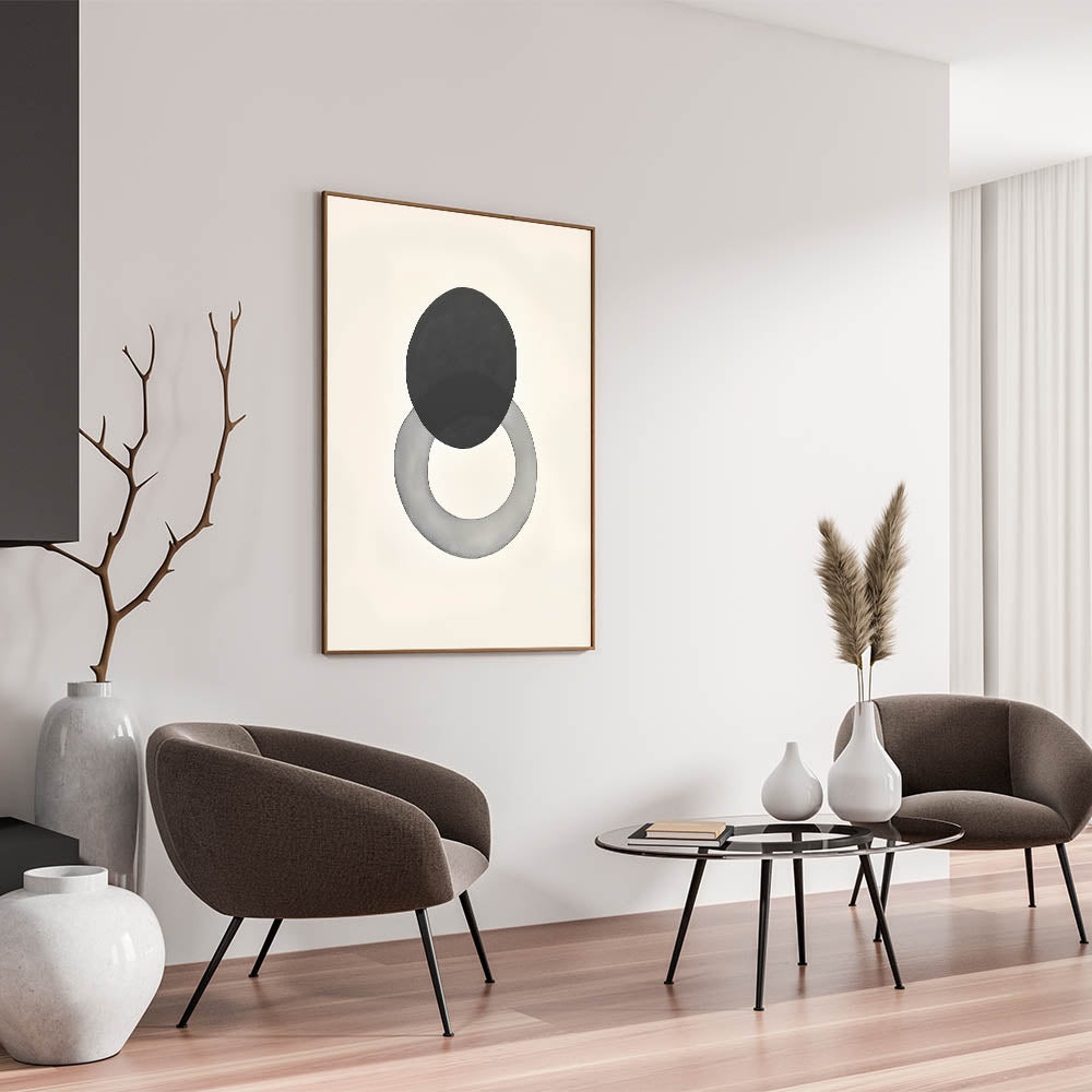 Bring a sense of simplicity and elegance to your decor with this minimalist black and gray circle art. Featuring a bold black circle atop a softer gray ring, this geometric design embodies modern sophistication and balance, ideal for minimalist and contemporary interiors. Available in various formats, including stretched canvas, acrylic glass, and framed prints, this artwork makes a refined focal point in any room.