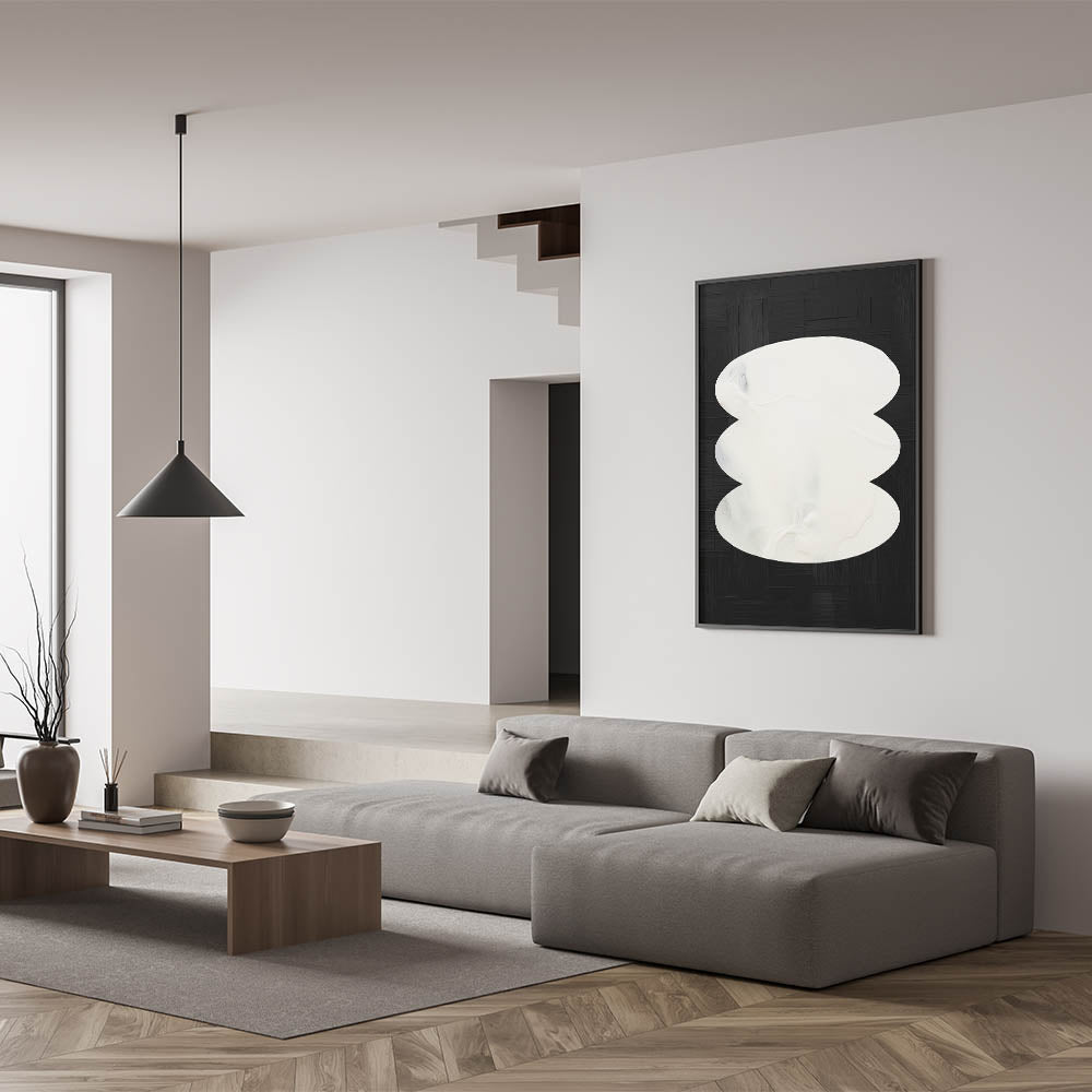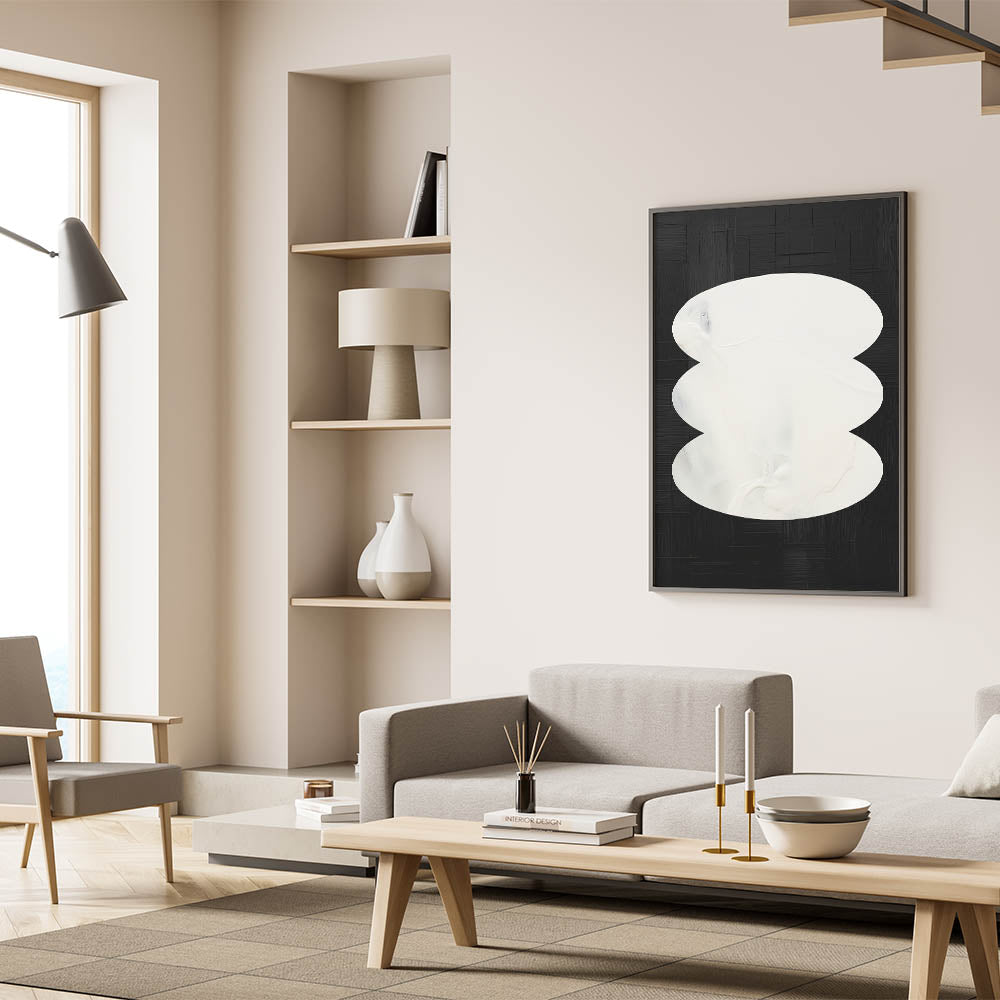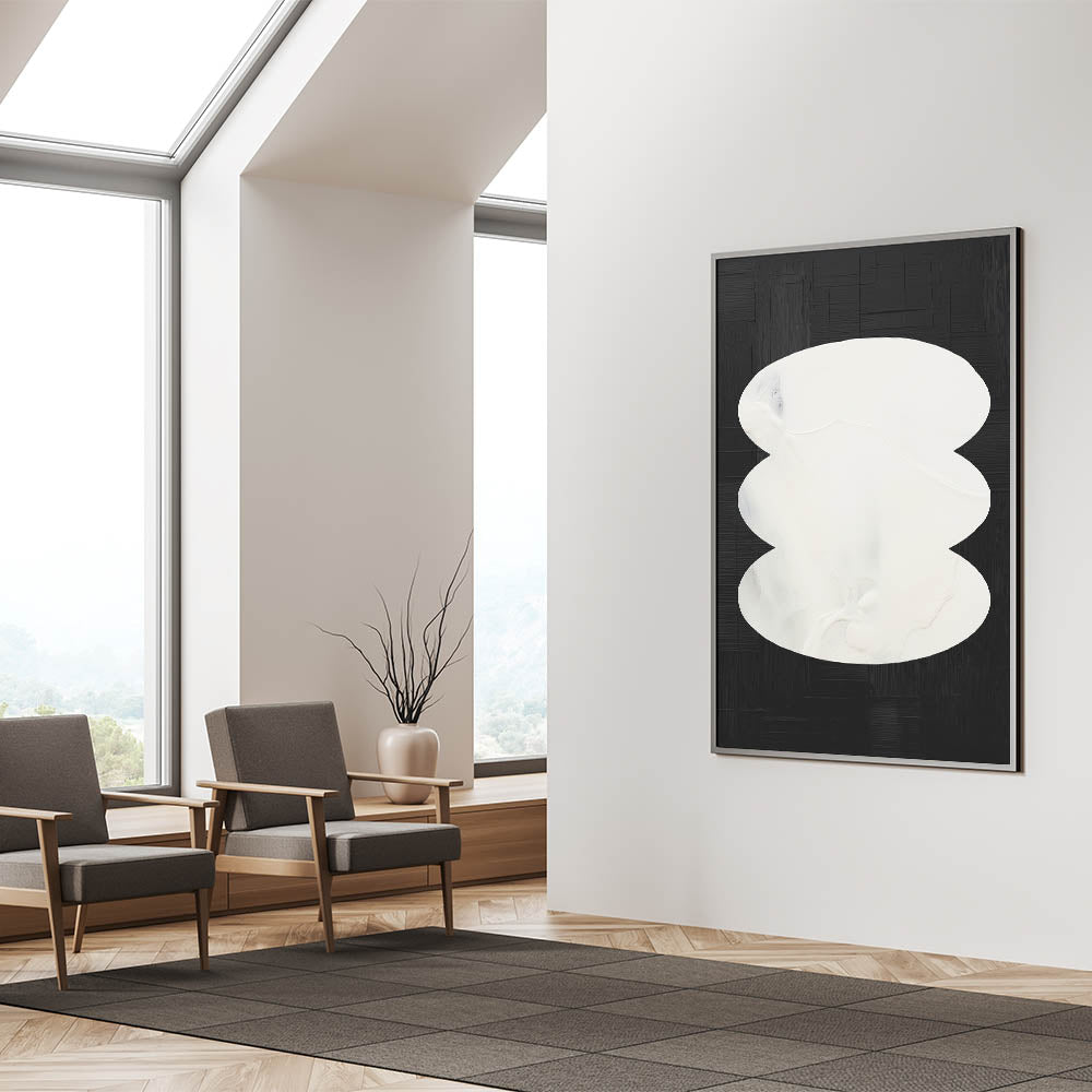 Elevate your space with this minimalist black and white abstract artwork. Featuring a unique organic shape in soft white tones against a striking black textured background, this piece embodies simplicity and sophistication. The contrast between the light and dark elements adds a modern, bold touch, making it perfect for minimalist and contemporary interiors. Its clean lines and fluid form create a statement piece that enhances any room with elegance.