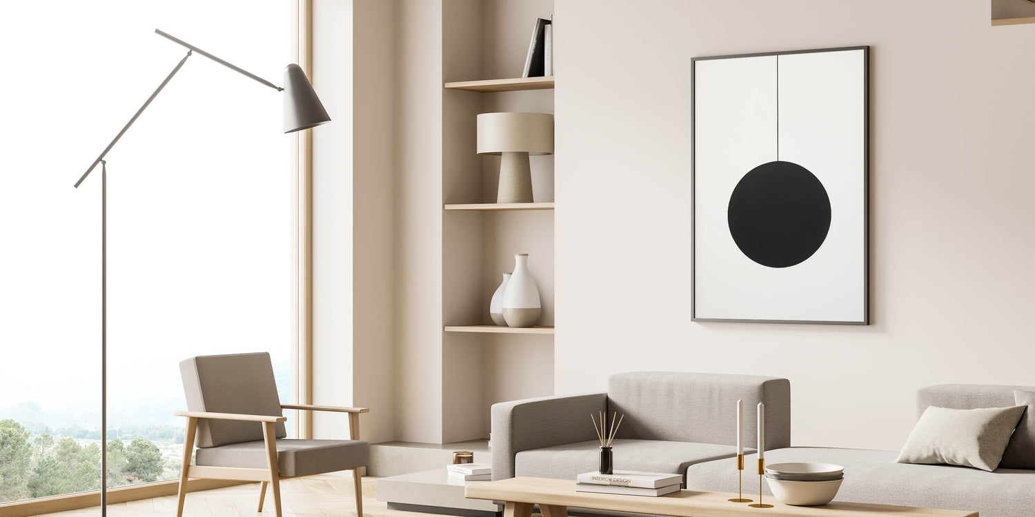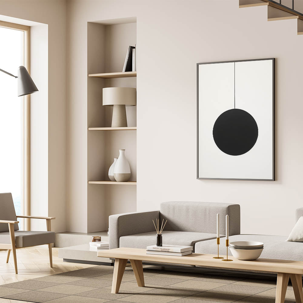 • High-quality minimalist canvas with a bold black sphere design.