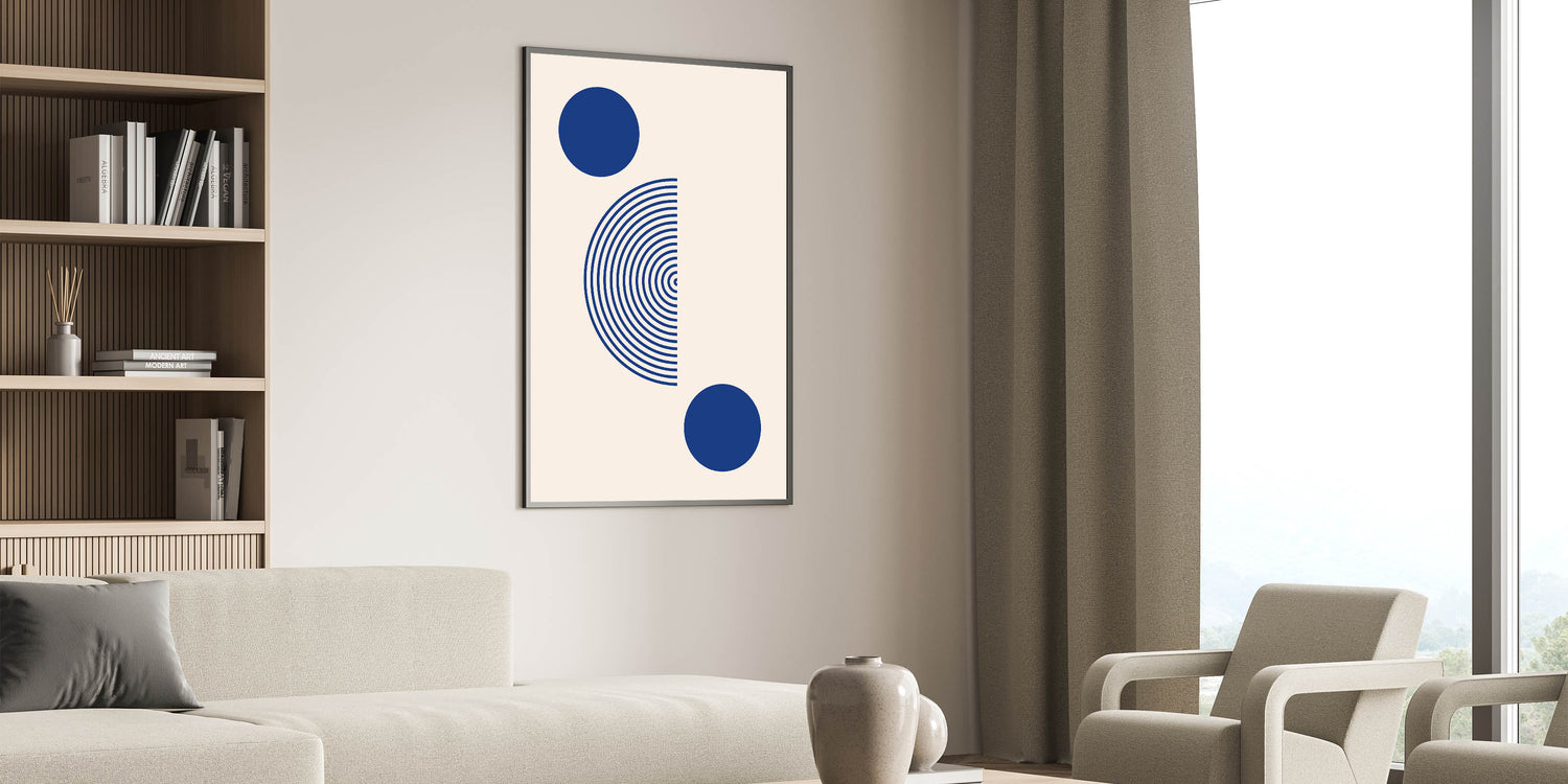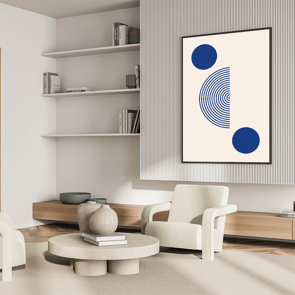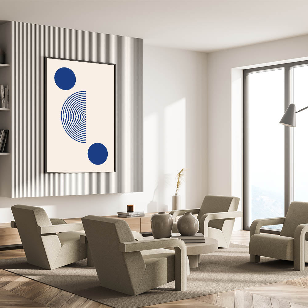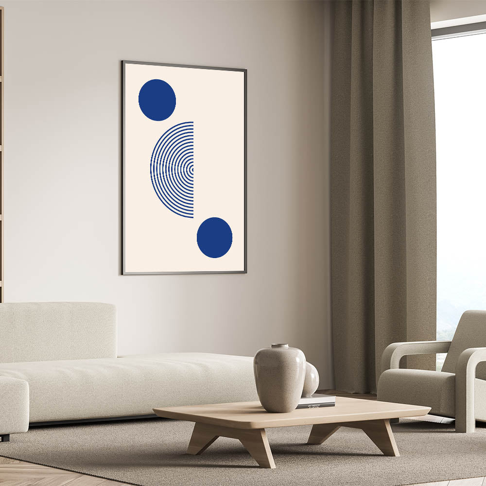 Add a touch of modern sophistication to your home with this minimalist boho wall art. The bold use of geometric shapes in deep blue against a neutral beige background creates a striking and balanced aesthetic. With its clean lines and concentric circles, this abstract bohemian canvas is perfect for enhancing modern and eclectic interiors. Whether displayed in a living room, bedroom, or office, this artwork adds a sleek and contemporary feel, making it a versatile addition to any decor style.