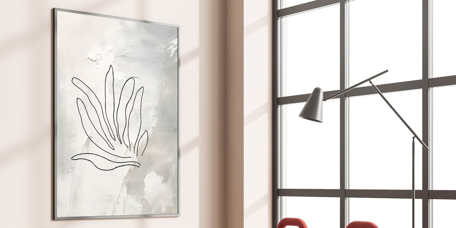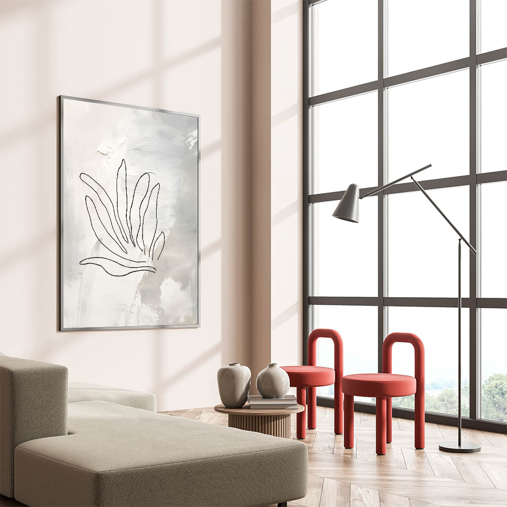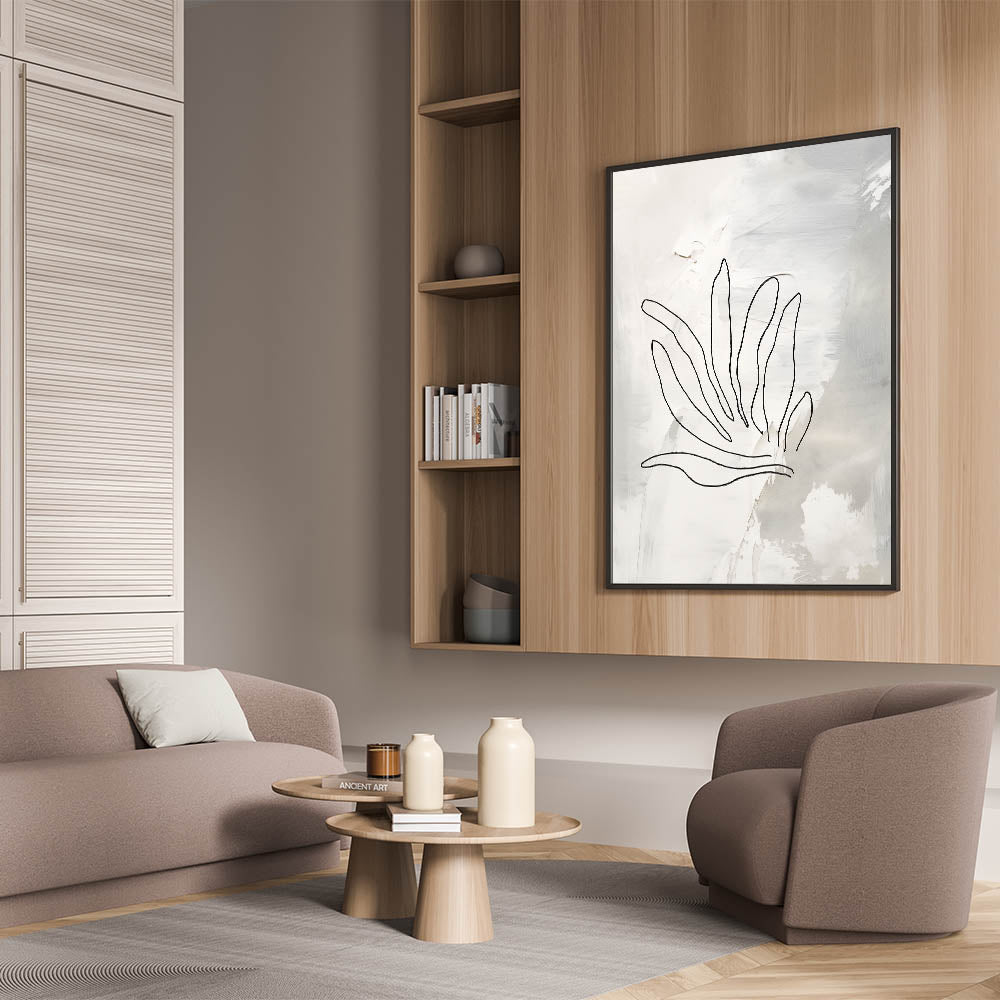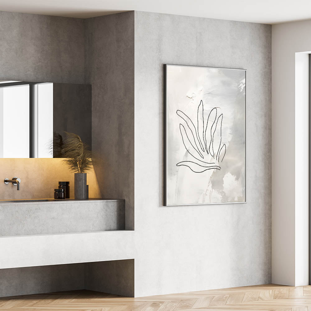 Enhance your home with this elegant minimalist botanical wall art. Featuring delicate line art of abstract plant leaves against a soft, neutral background, this piece is the epitome of modern simplicity. Its subtle design and muted tones make it perfect for contemporary interiors, adding a touch of nature-inspired elegance to any space.