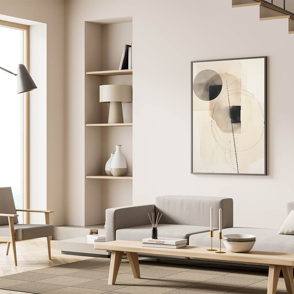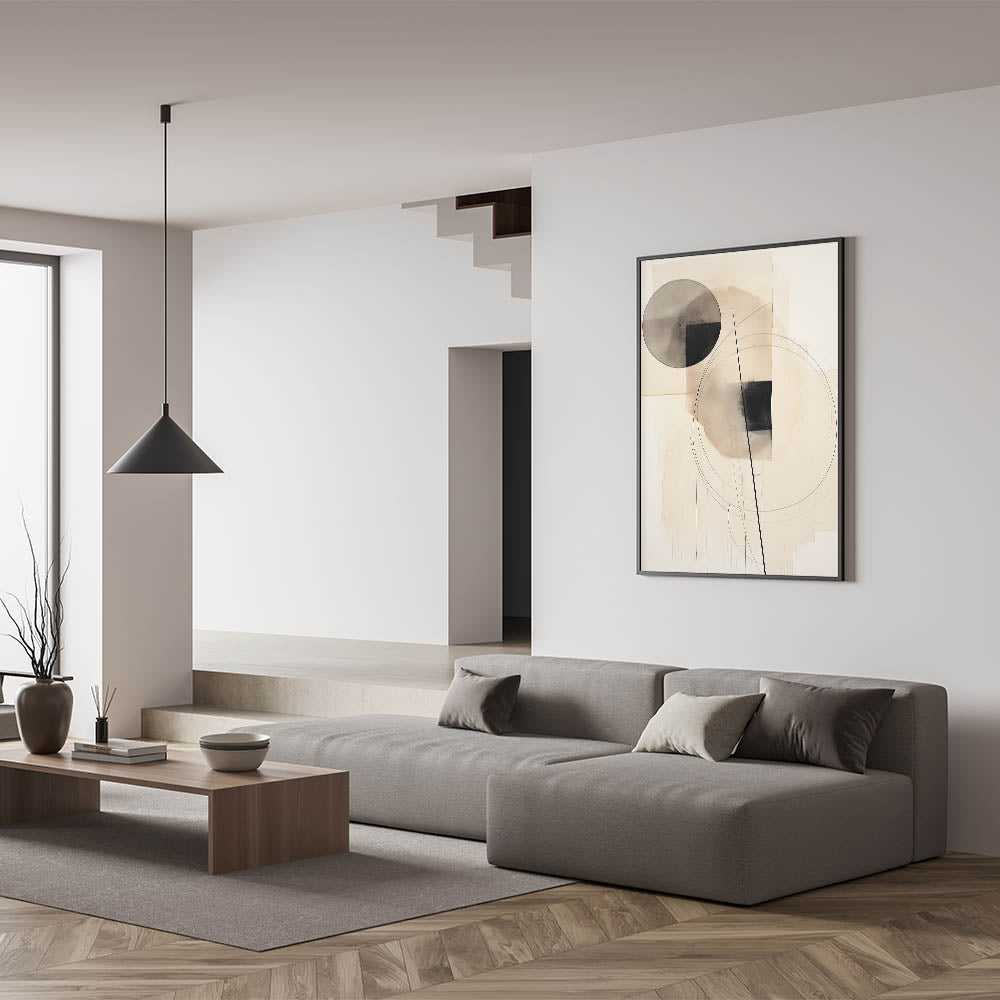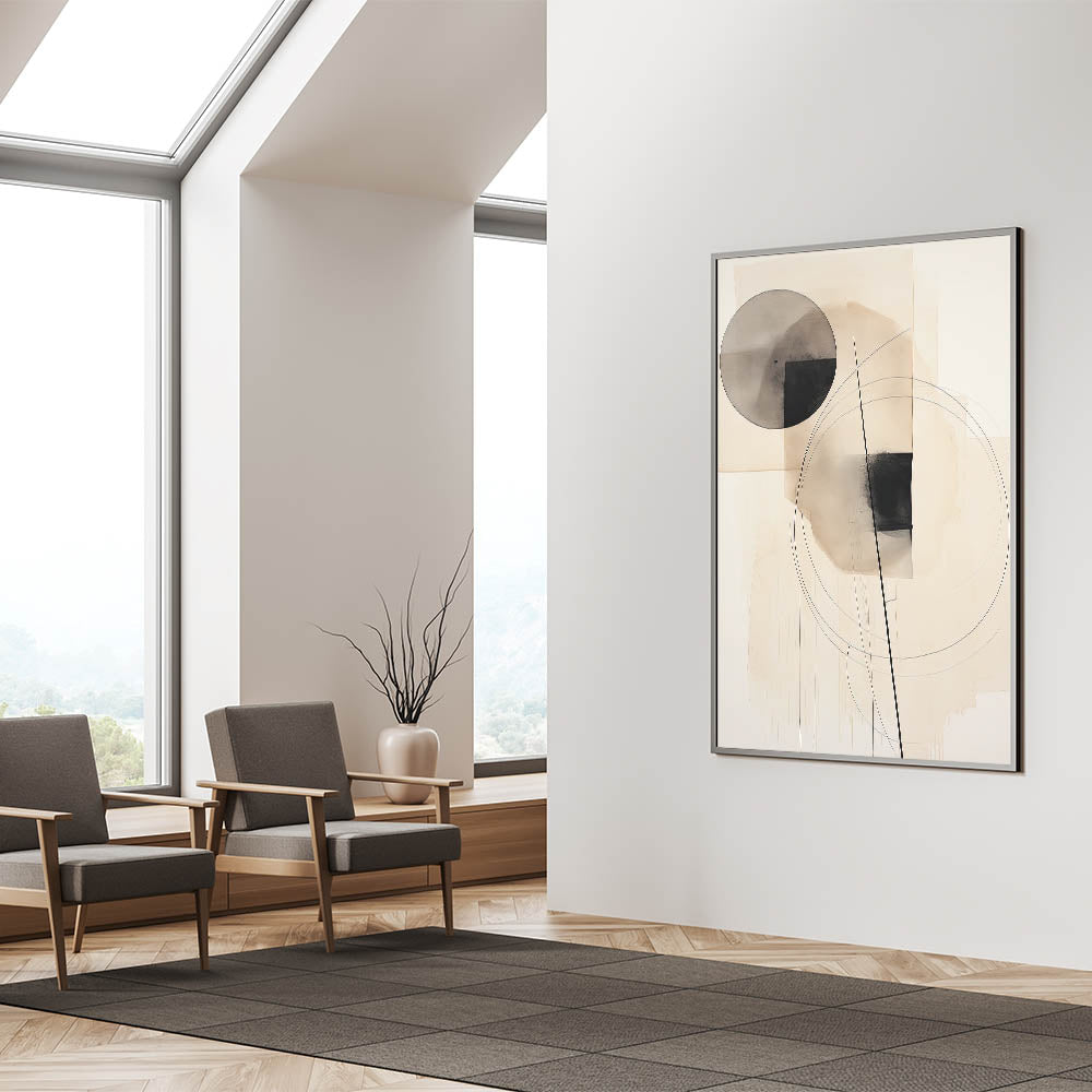 Enhance your space with this minimalist circle and line art, featuring a refined blend of geometric shapes in black and beige tones. This abstract composition balances circles, squares, and fine line accents, creating an elegant and harmonious design that brings a touch of sophistication to any modern decor. Perfect for minimalist and contemporary interiors, this artwork adds a calm and artistic element to your space.